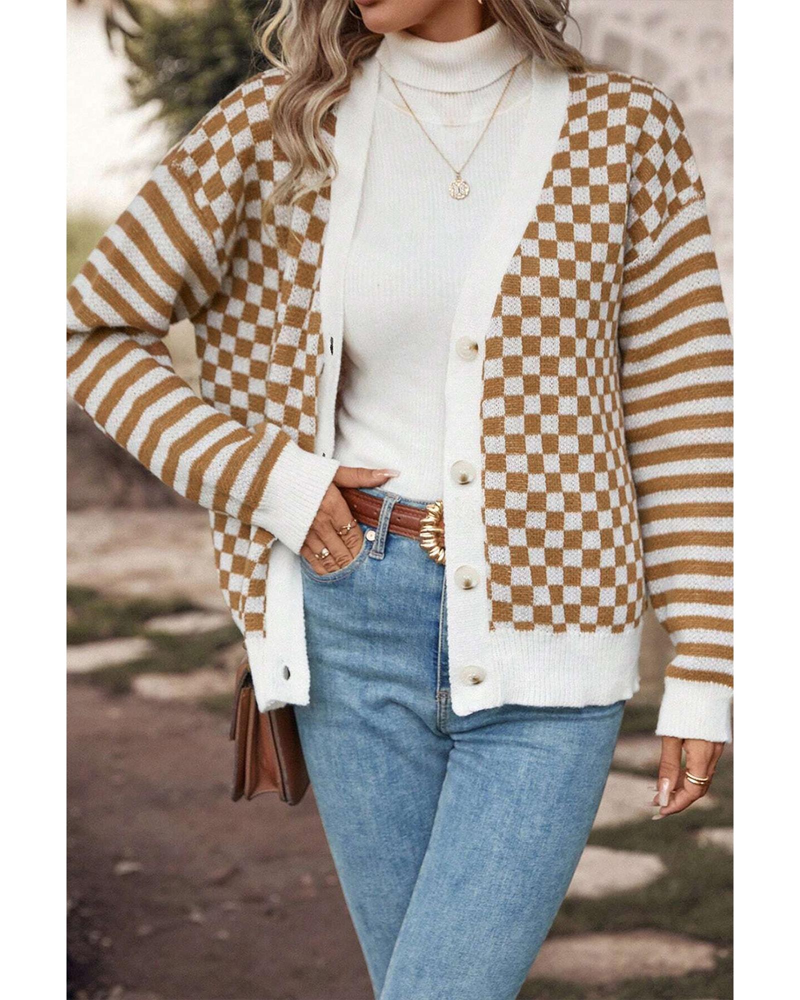 Brown Checkered Striped Patched Buttoned V Neck Cardigan – S