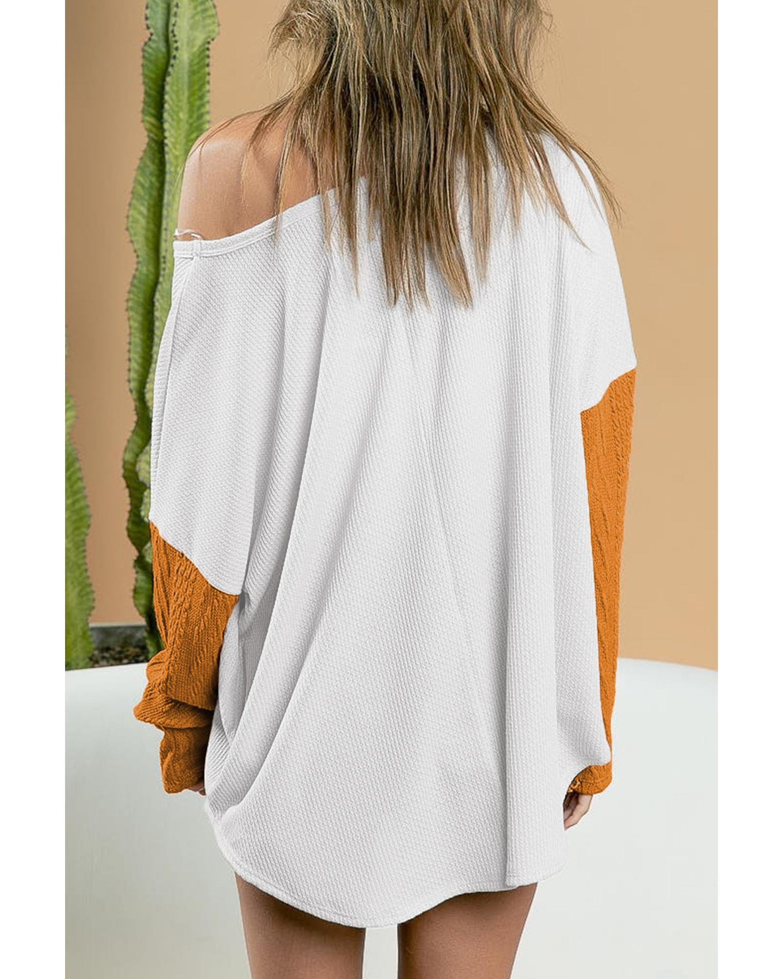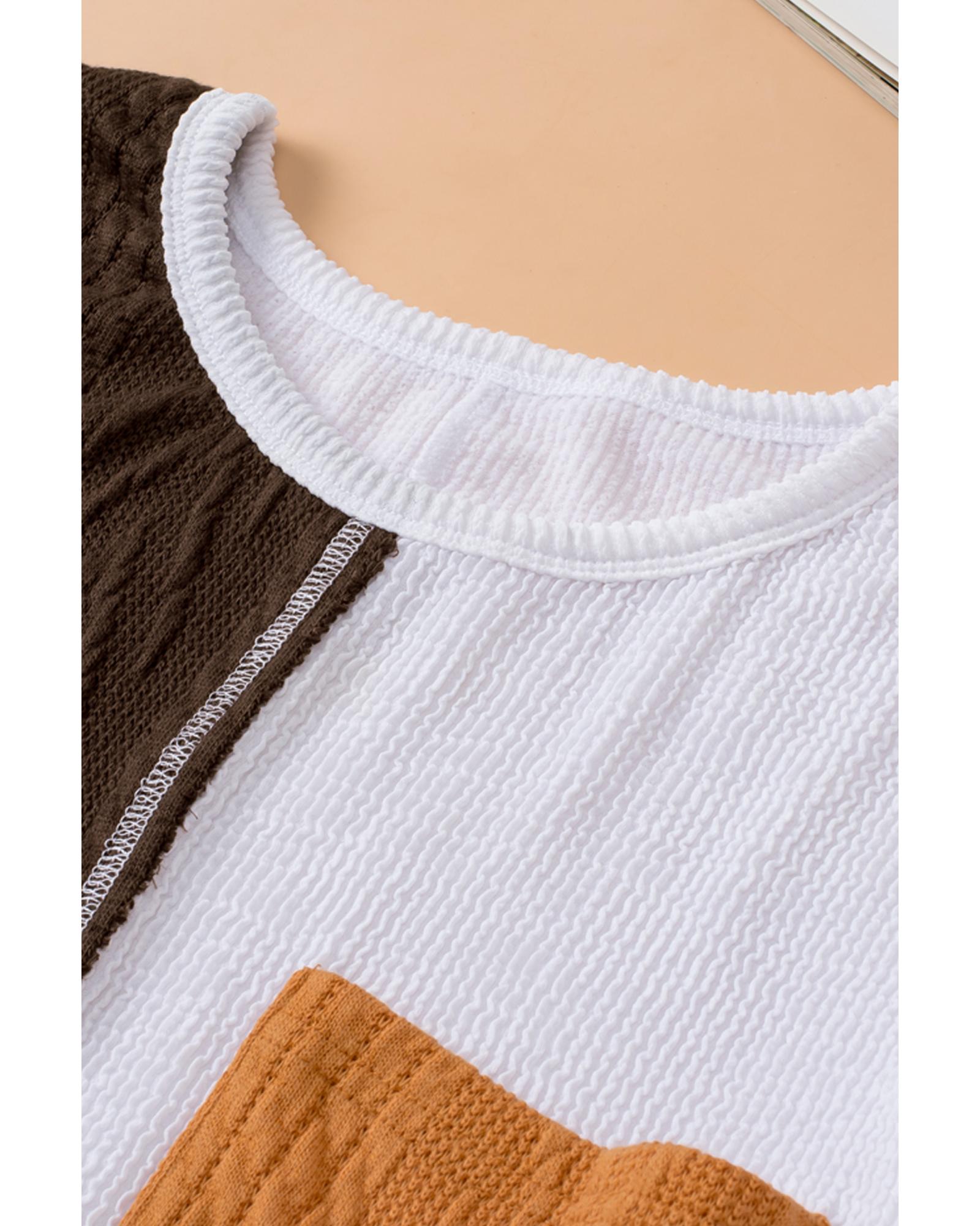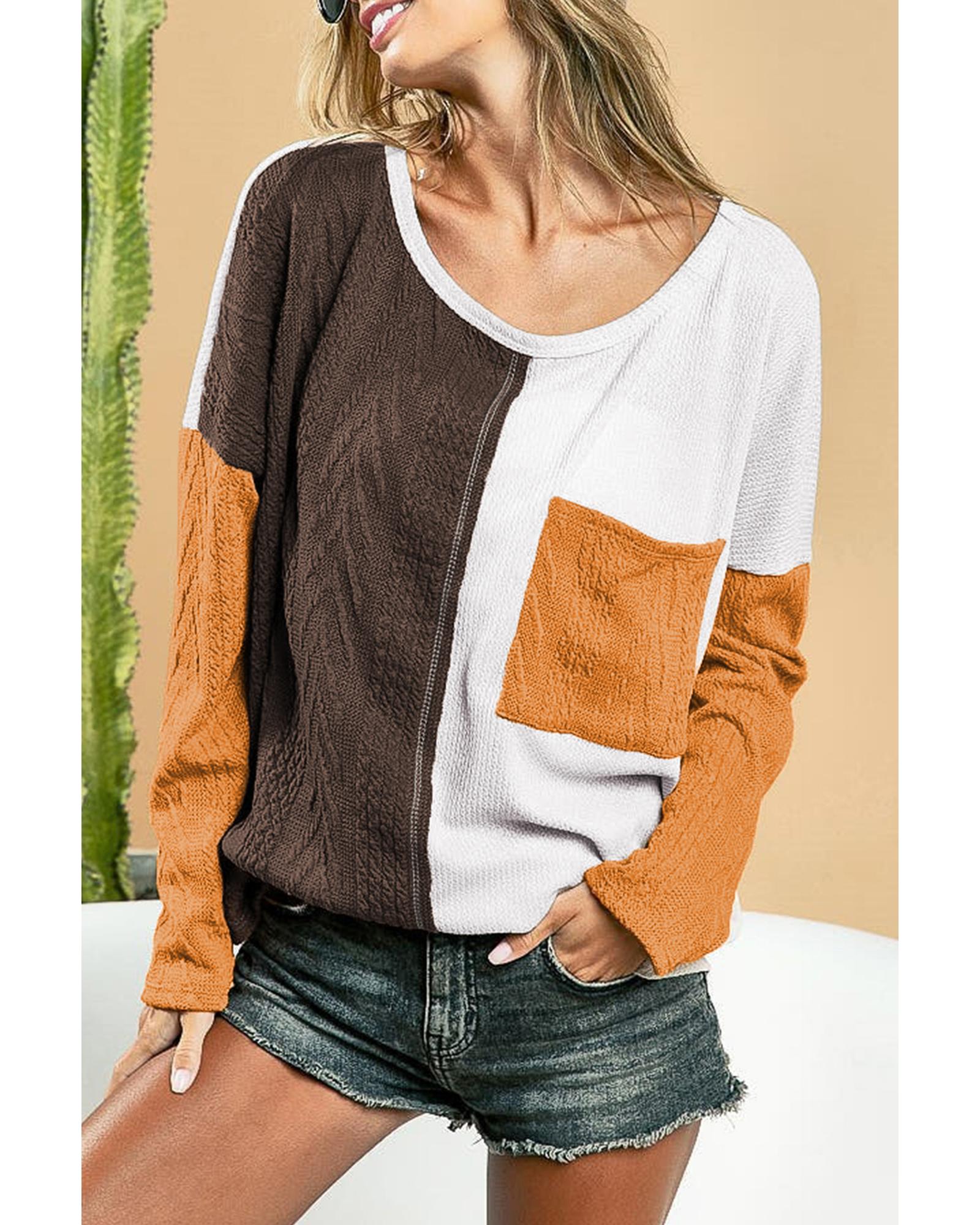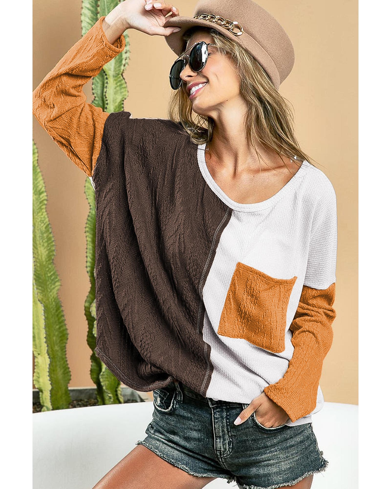 Brown Color Block Patchwork Chest Pocket Long Sleeve Top – L