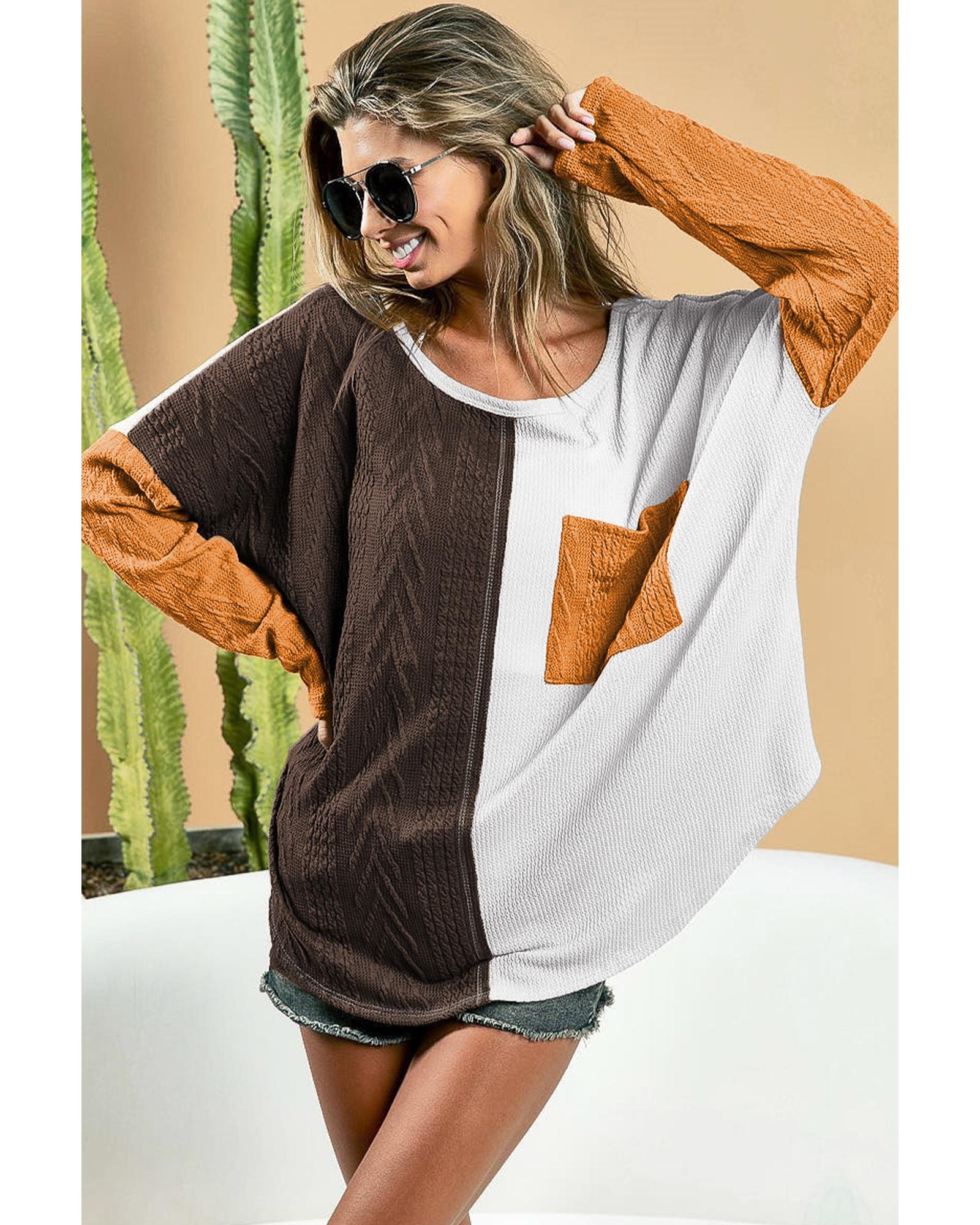Brown Color Block Patchwork Chest Pocket Long Sleeve Top – M