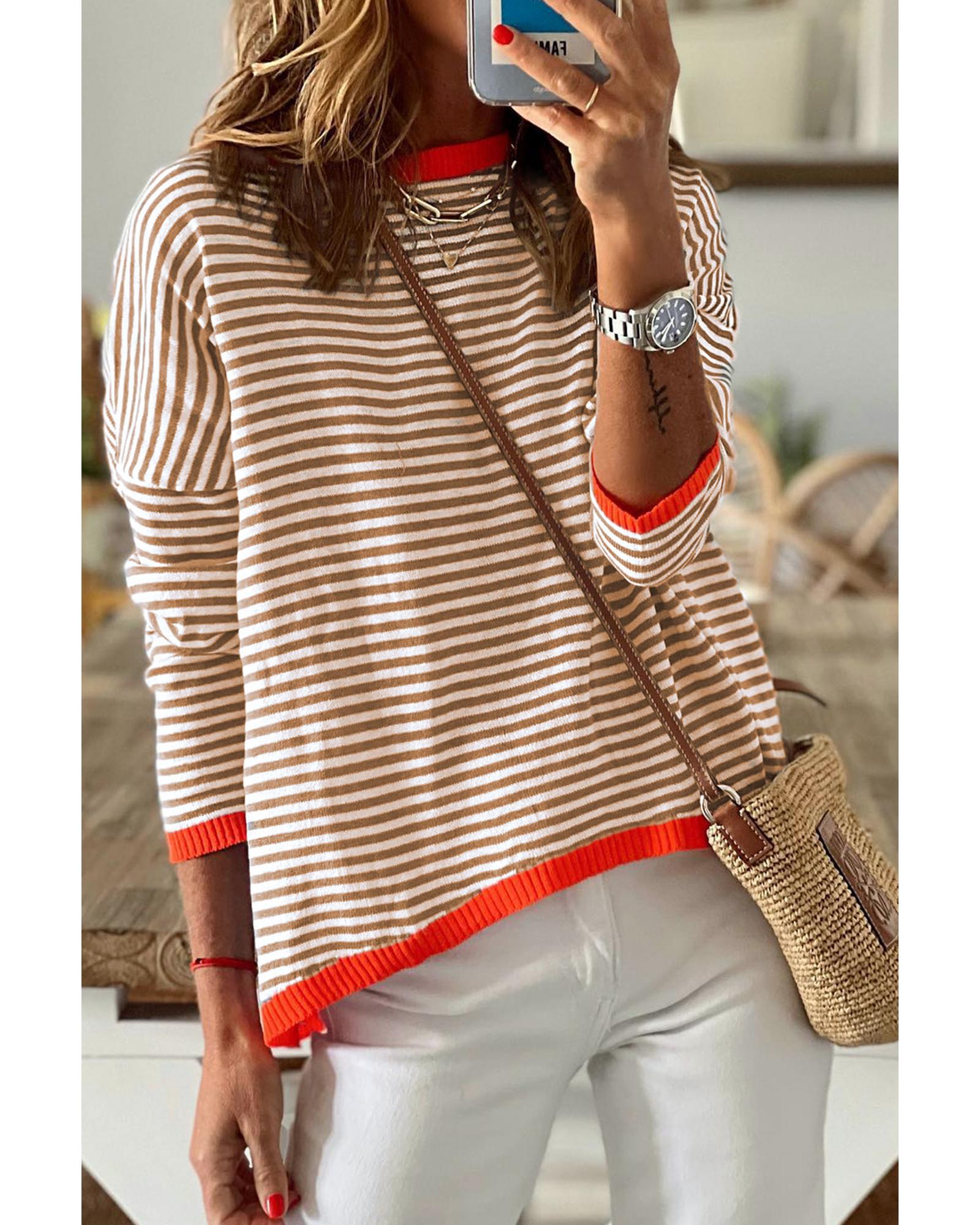 Classic striped sweater with contrast trimmed detailing Chic and comfortable drop shoulder design Regular fit style suitable for most body shapes Versatile piece that pairs well with jeans joggers or skirts Available in various sizes