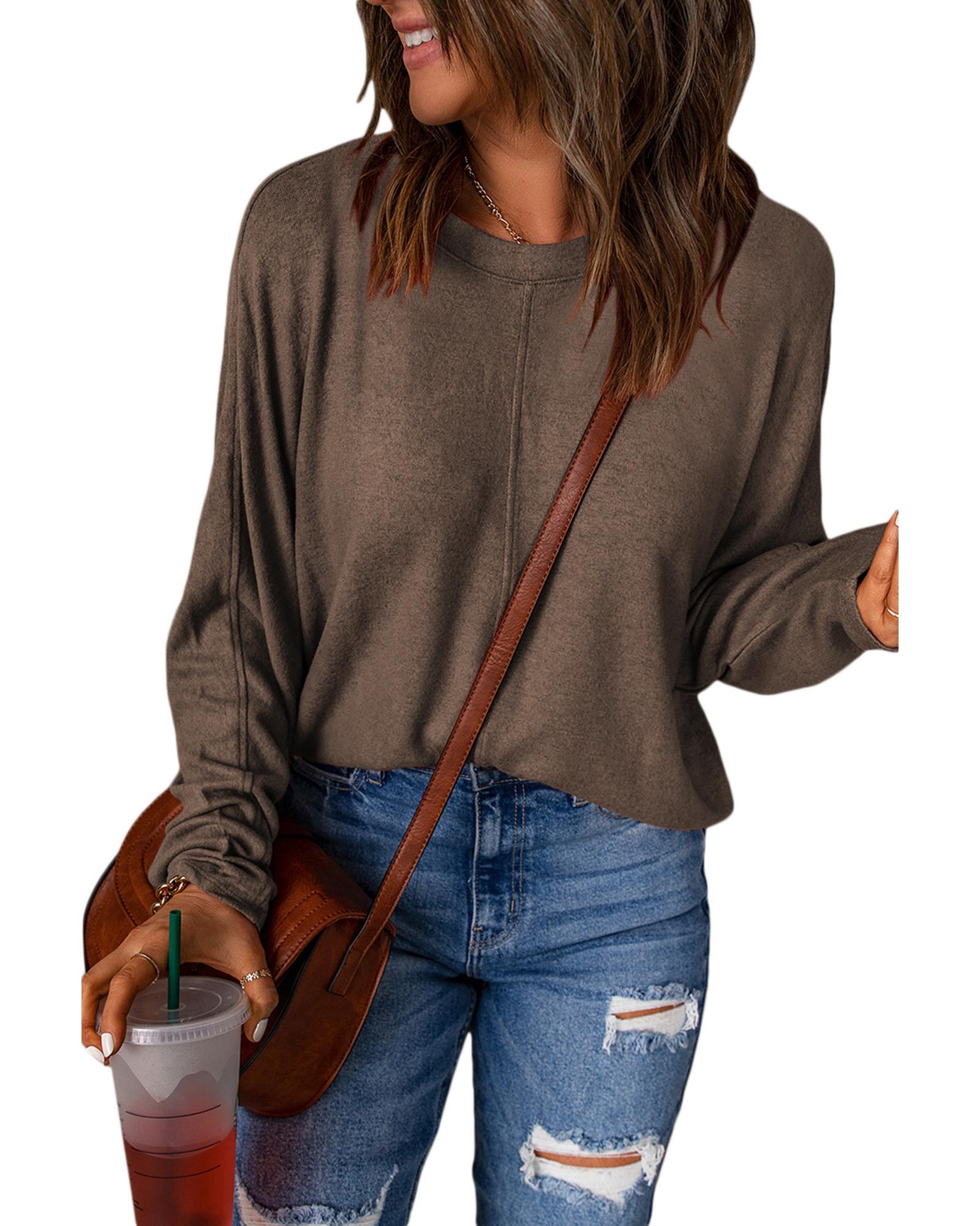 Brown Fiery Solid Color Patchwork Long Sleeve Top – XL