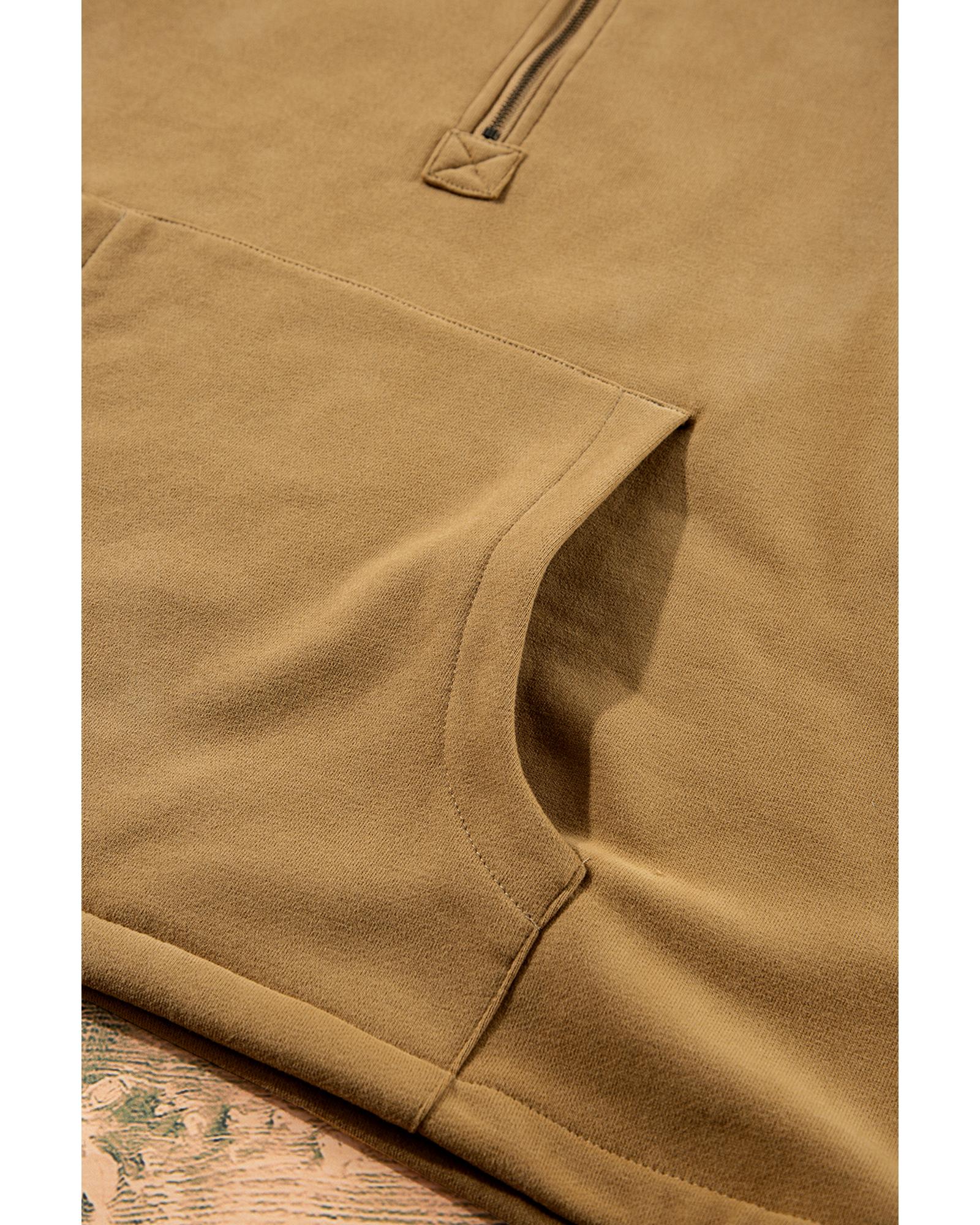 Brown Fleece Lined Half Zipper Kangaroo Pockets Loose Hoodie – 2XL