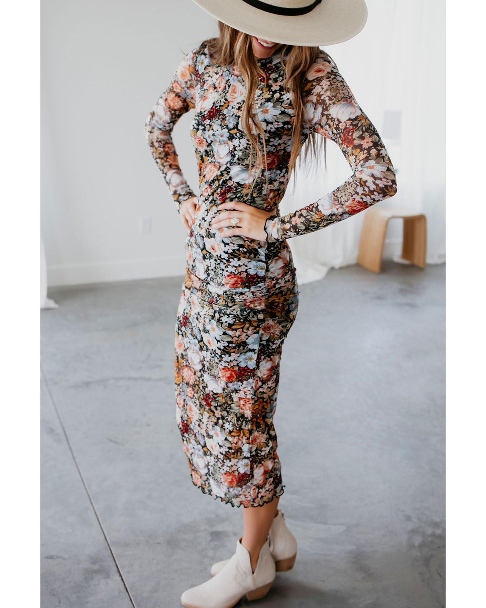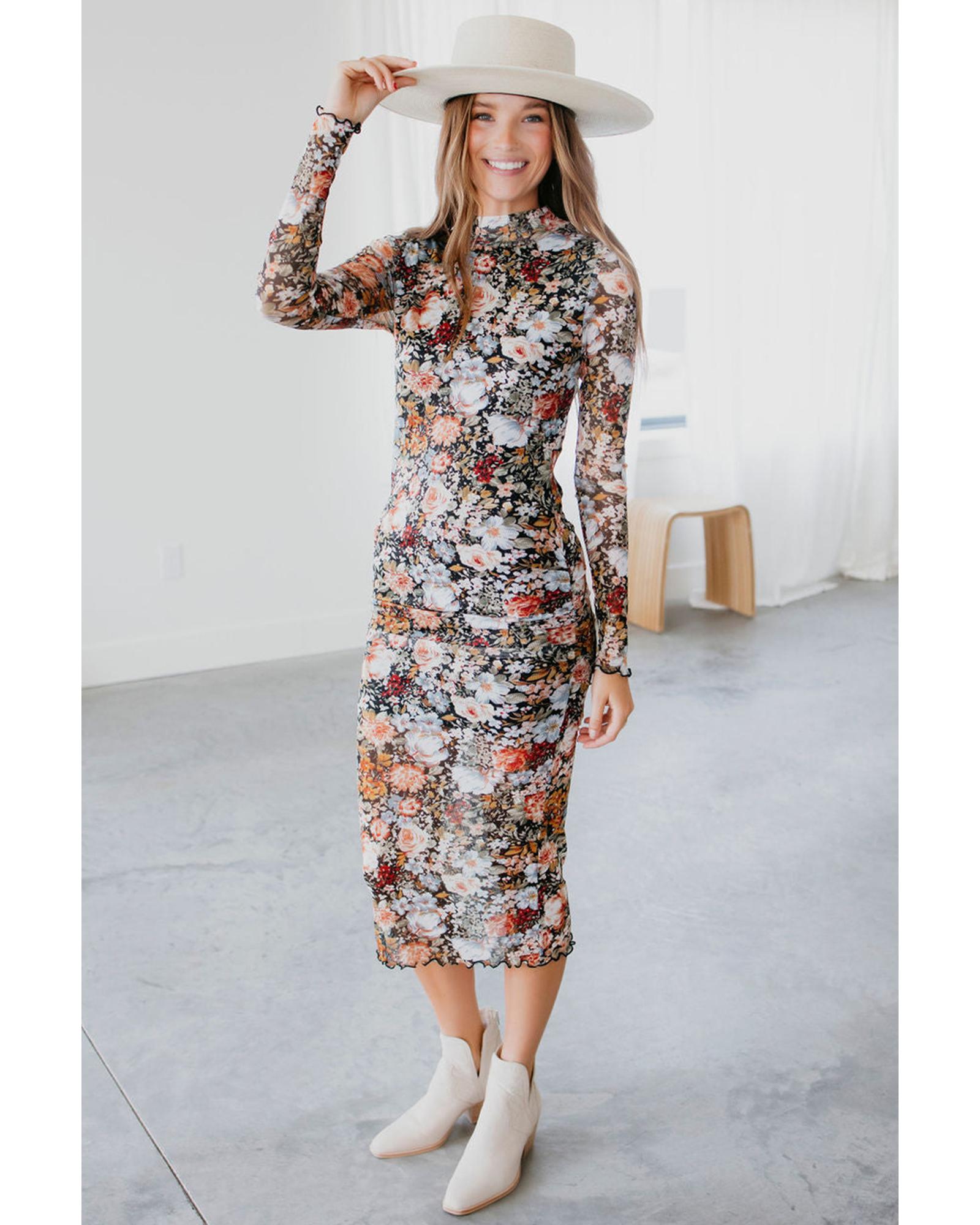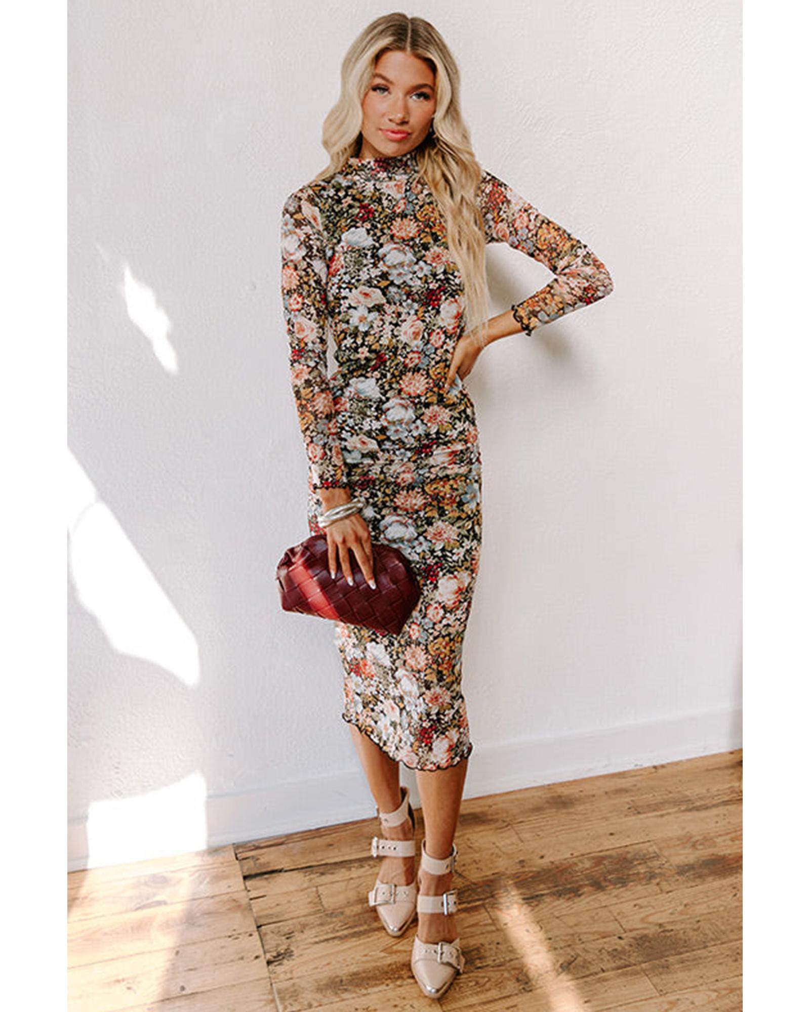 Brown Floral Allover Print Mock Neck Bodycon Long Sleeve Midi Dress – M