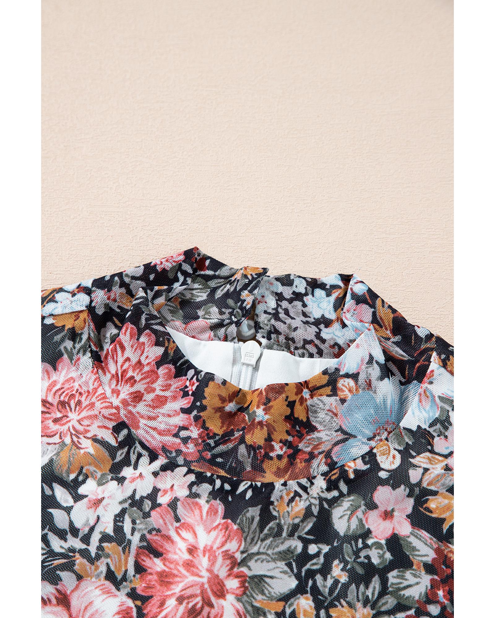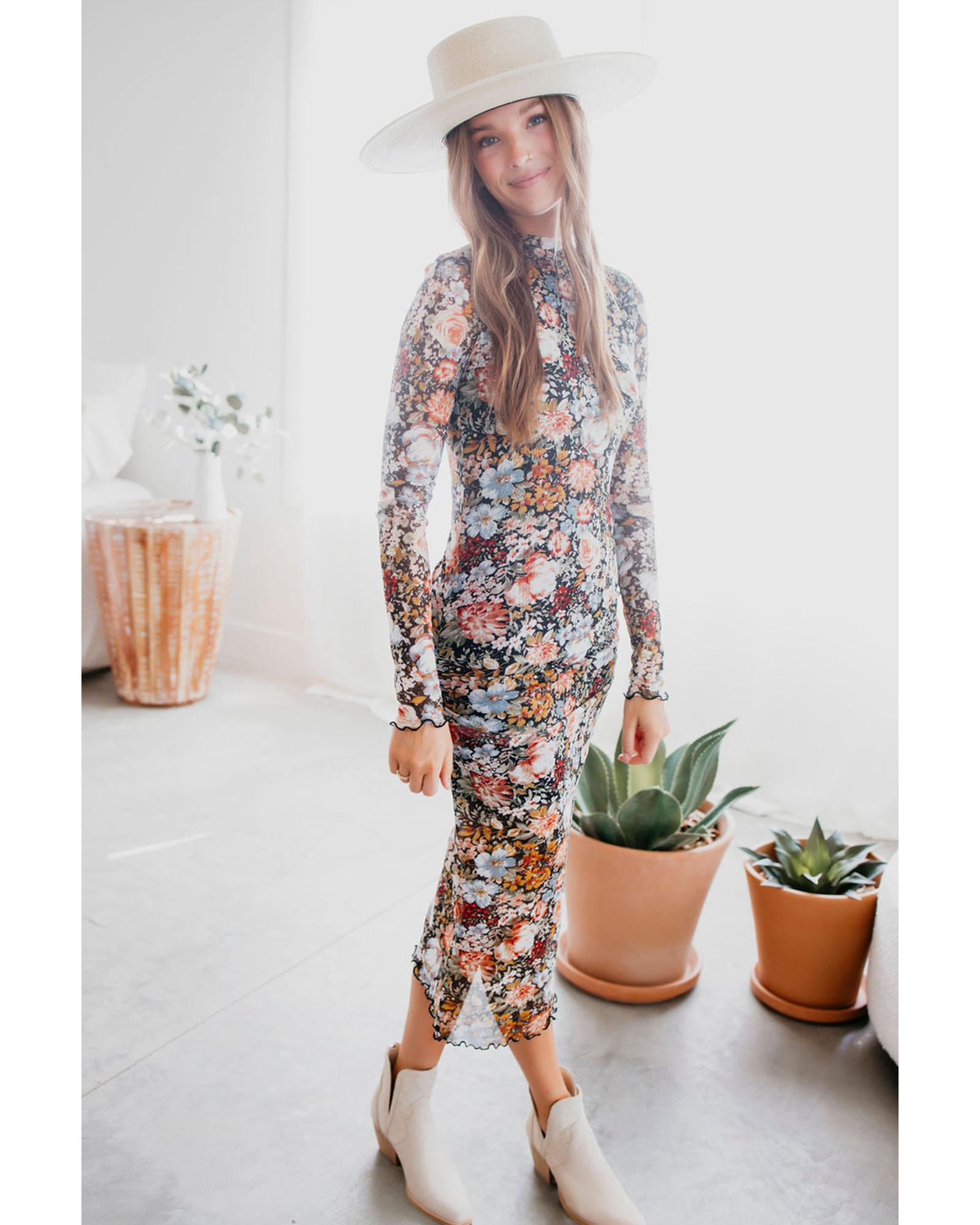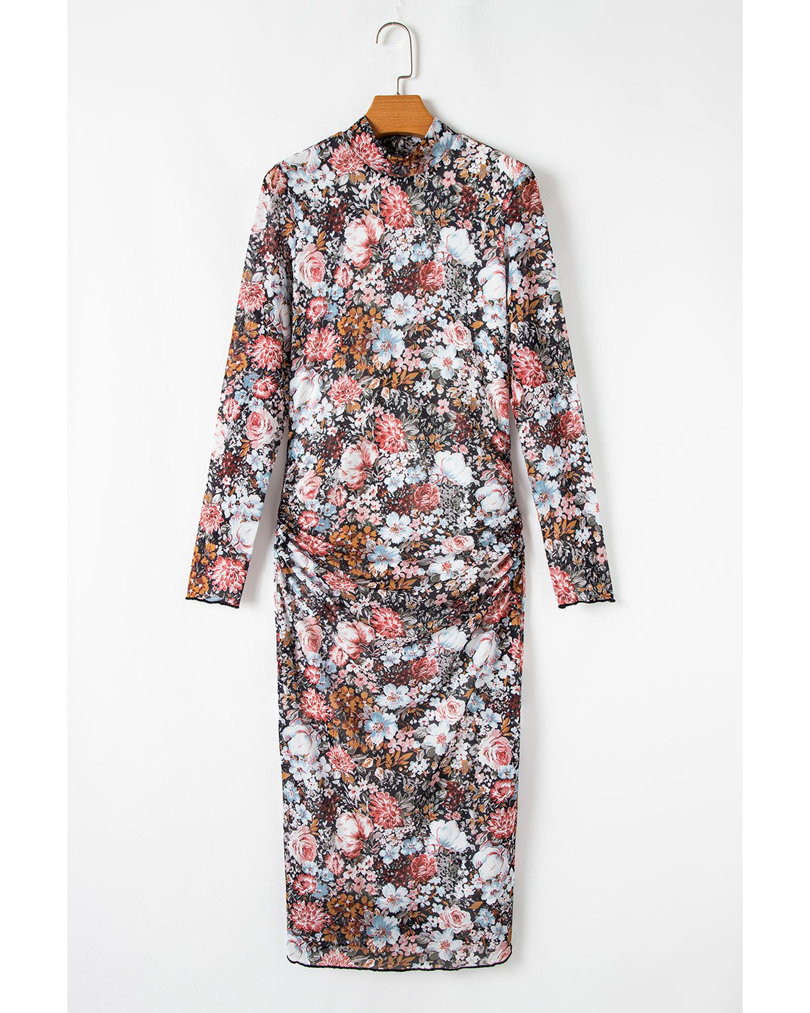 Brown Floral Allover Print Mock Neck Bodycon Long Sleeve Midi Dress – M