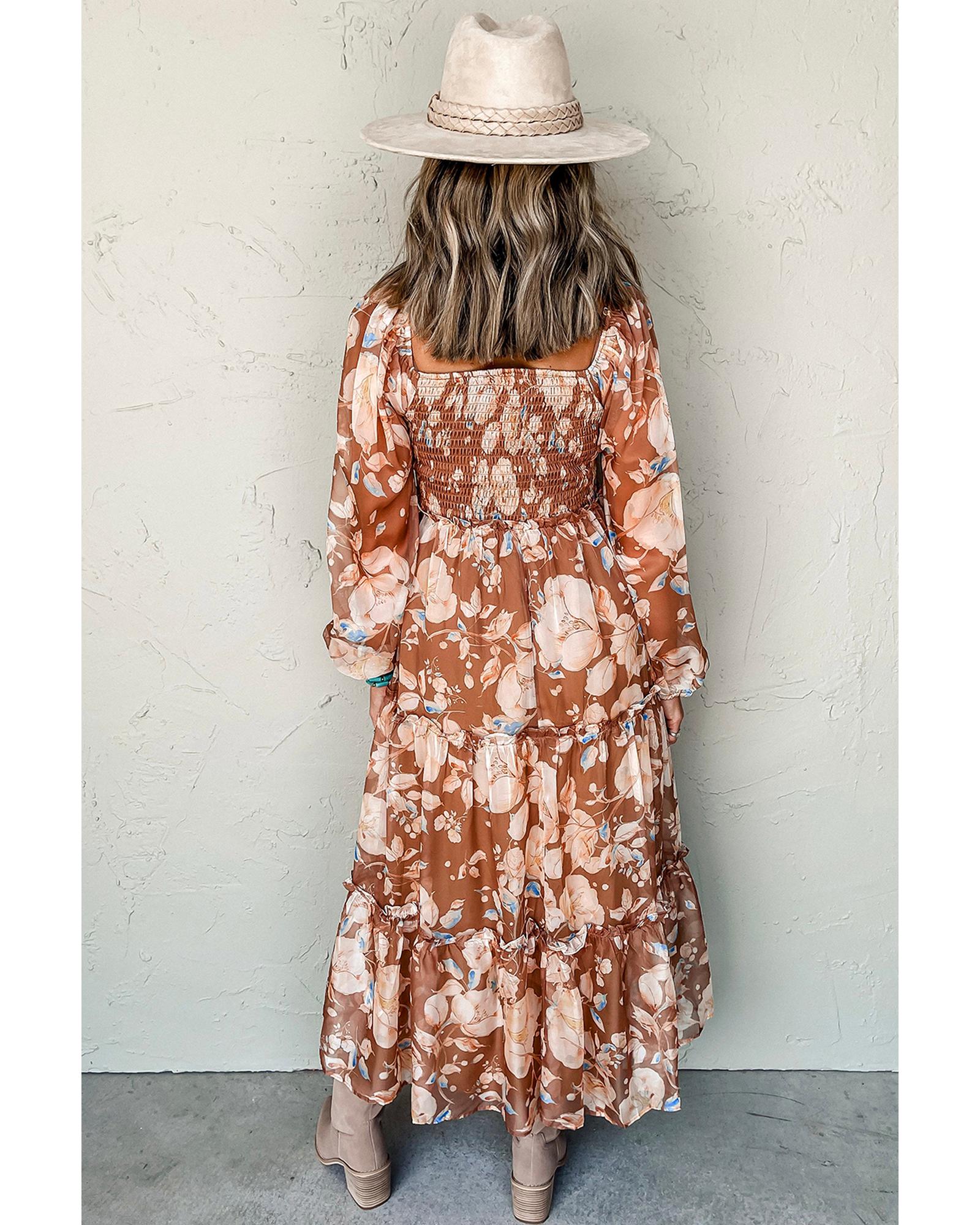 - Brown Floral Print Shirred Square Neck High Waist Maxi Dress