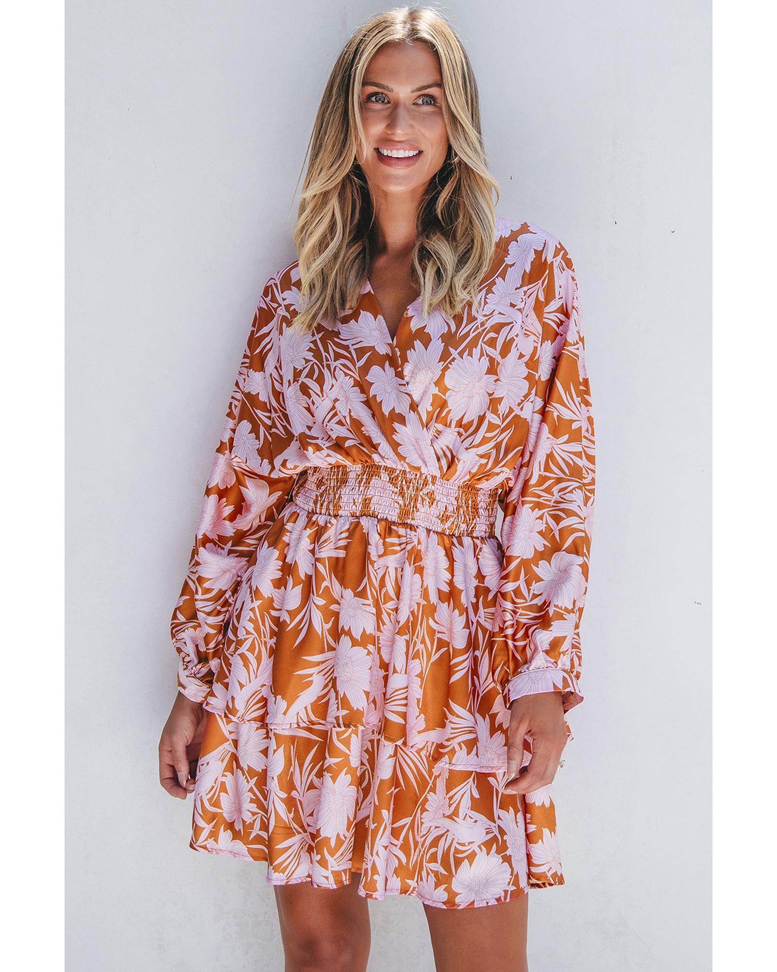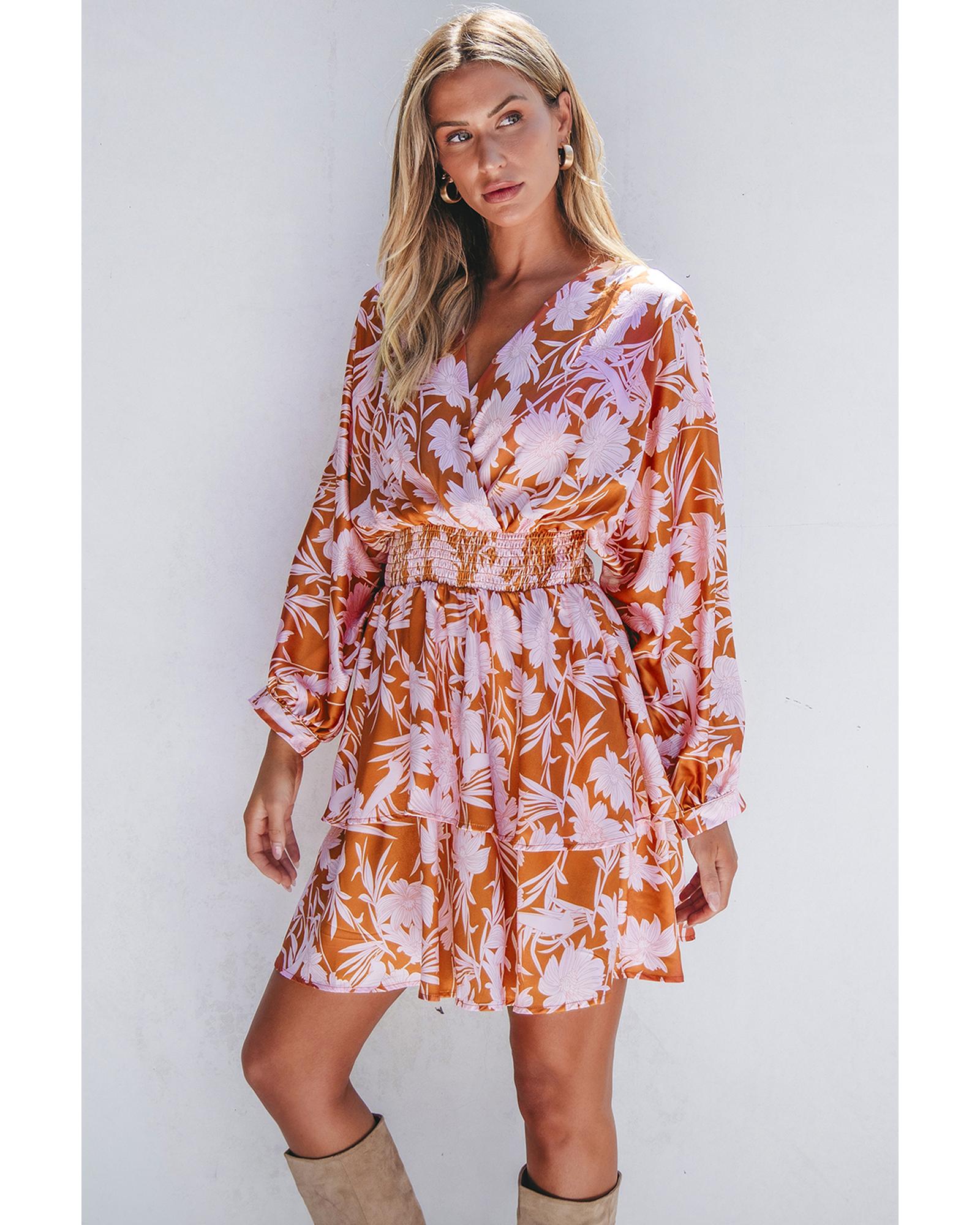 Brown Floral Puff Sleeve Smocked Waist Layered Dress – XL