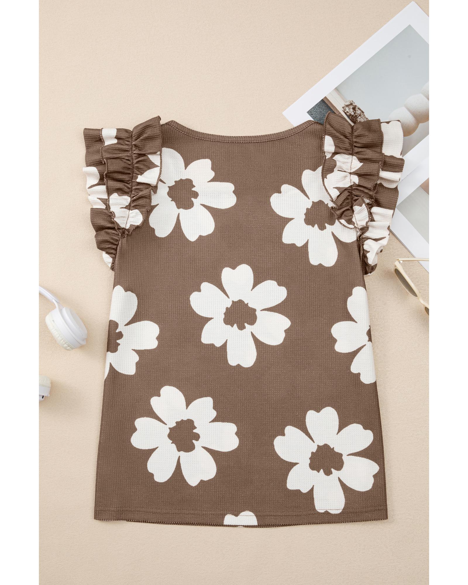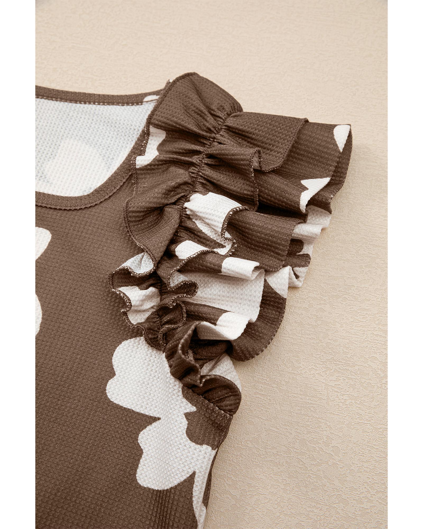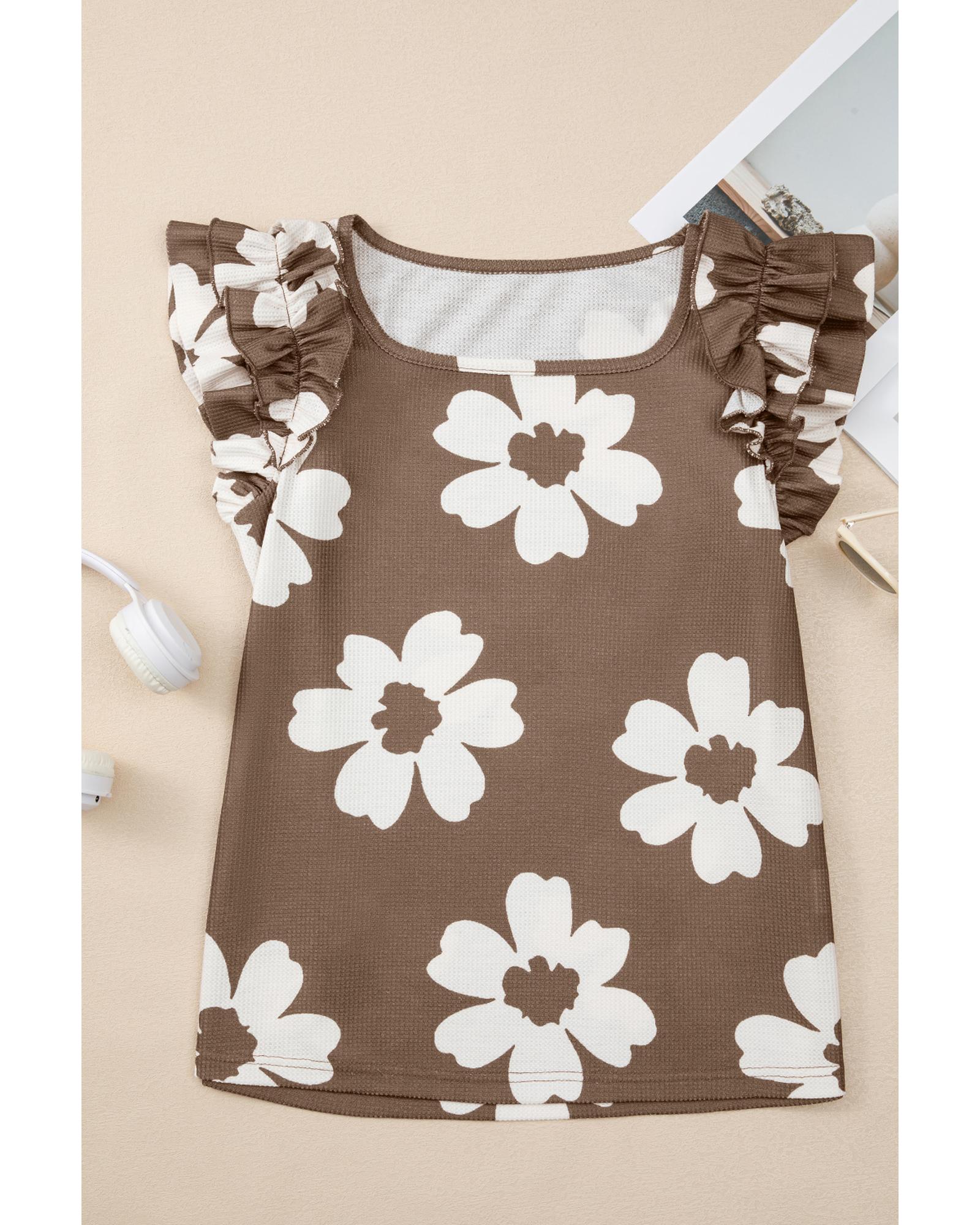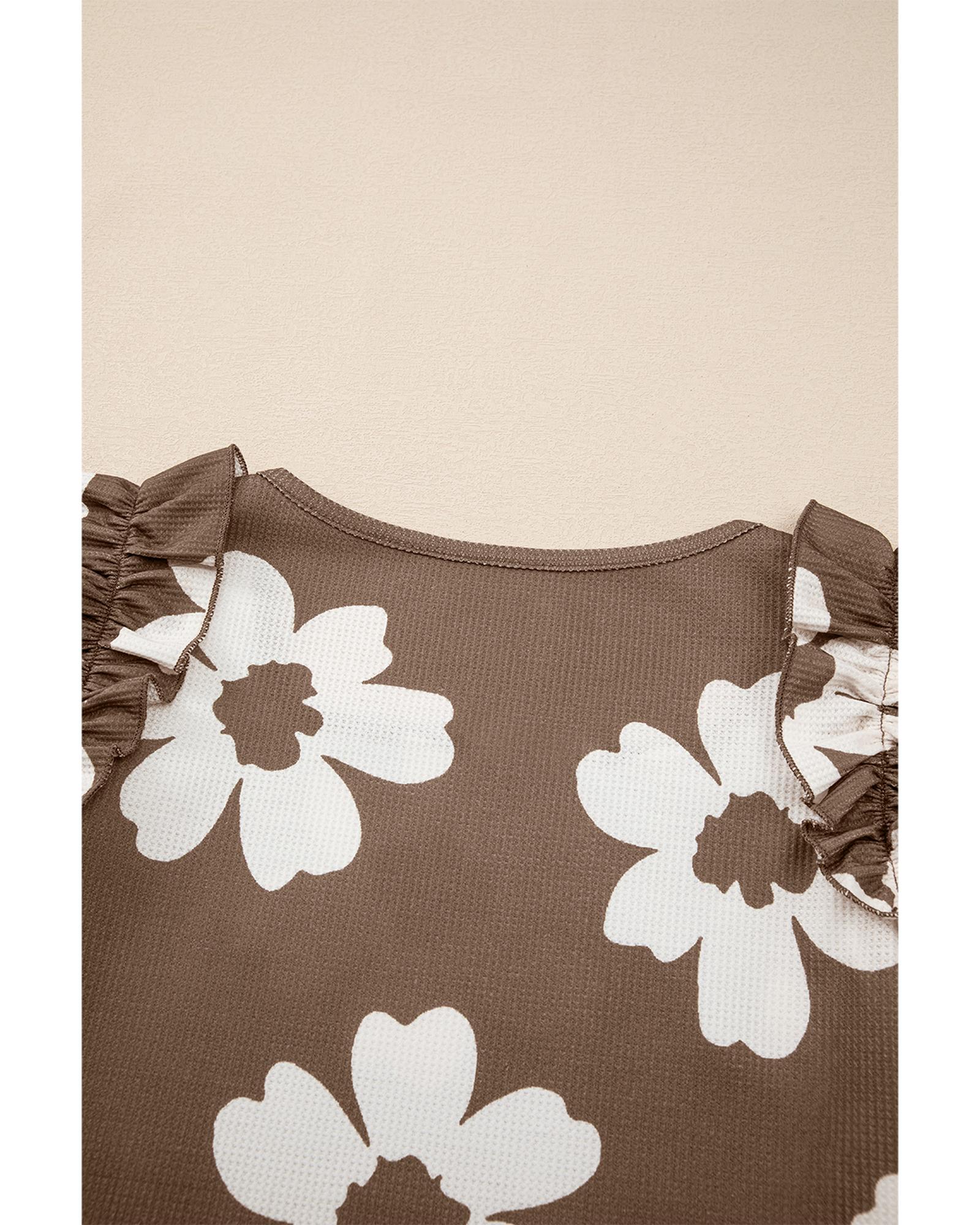 Brown Floral Textured Ruffled Short Sleeve Square Neck Blouse – S