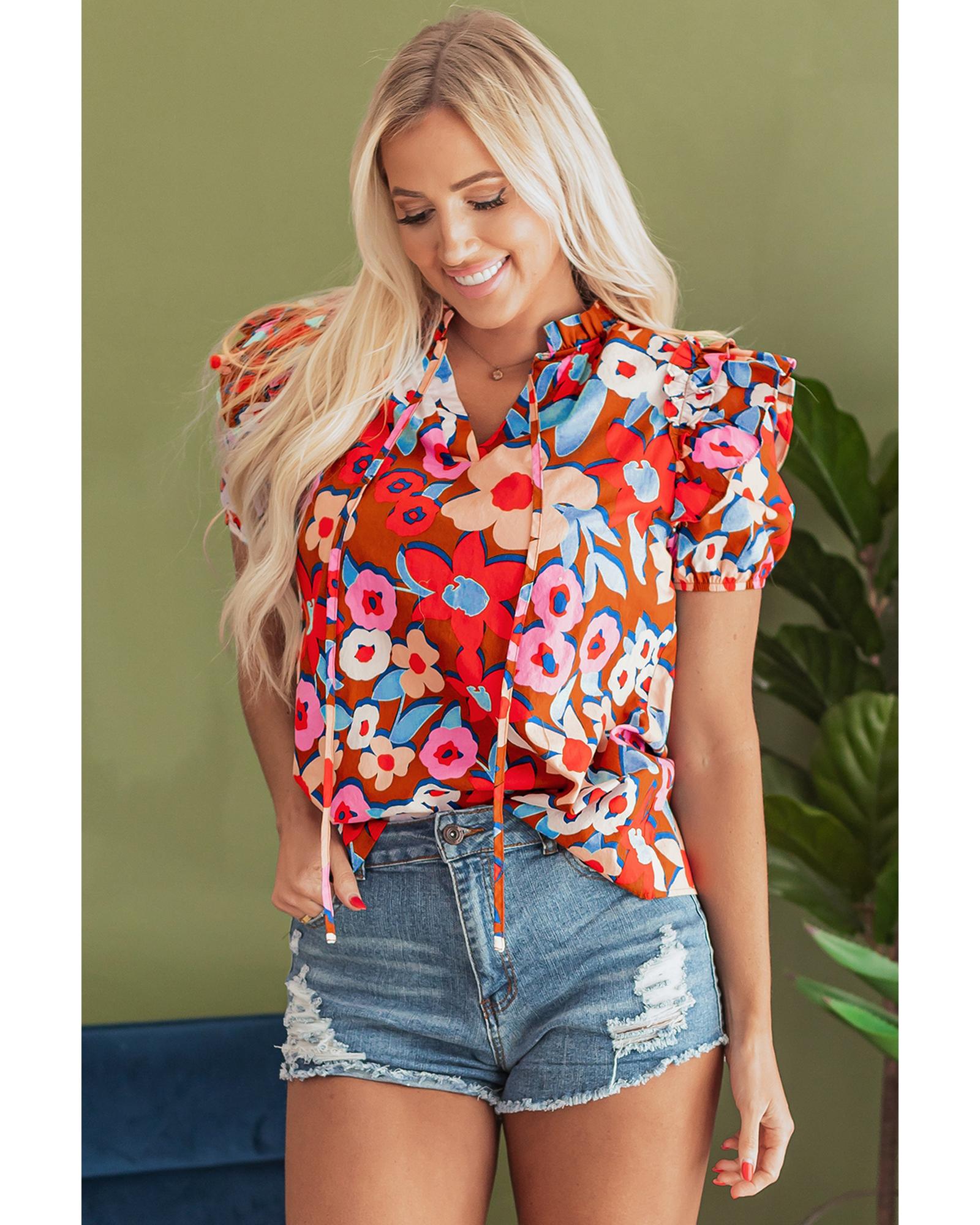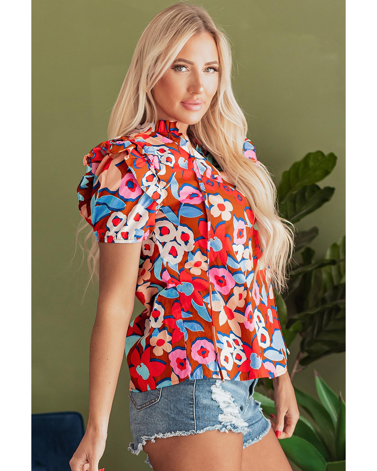 Brown Flower Print Self Tie Frilled Collar Puff Sleeve Blouse – M