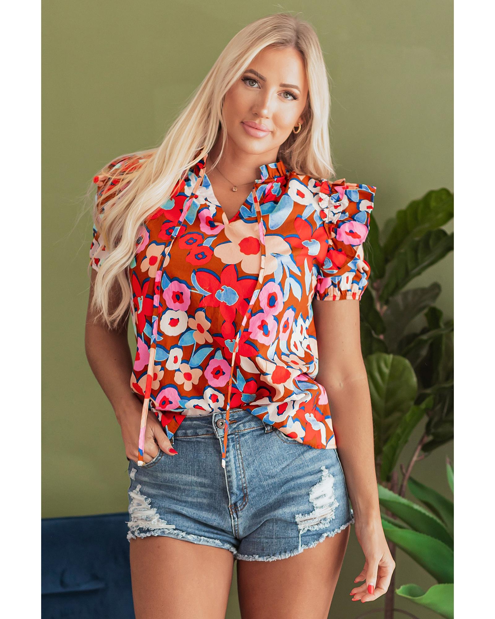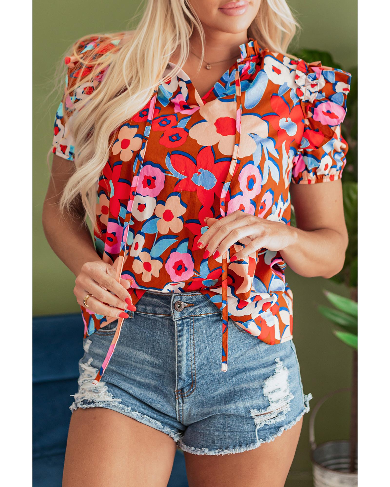 Brown Flower Print Self Tie Frilled Collar Puff Sleeve Blouse – S