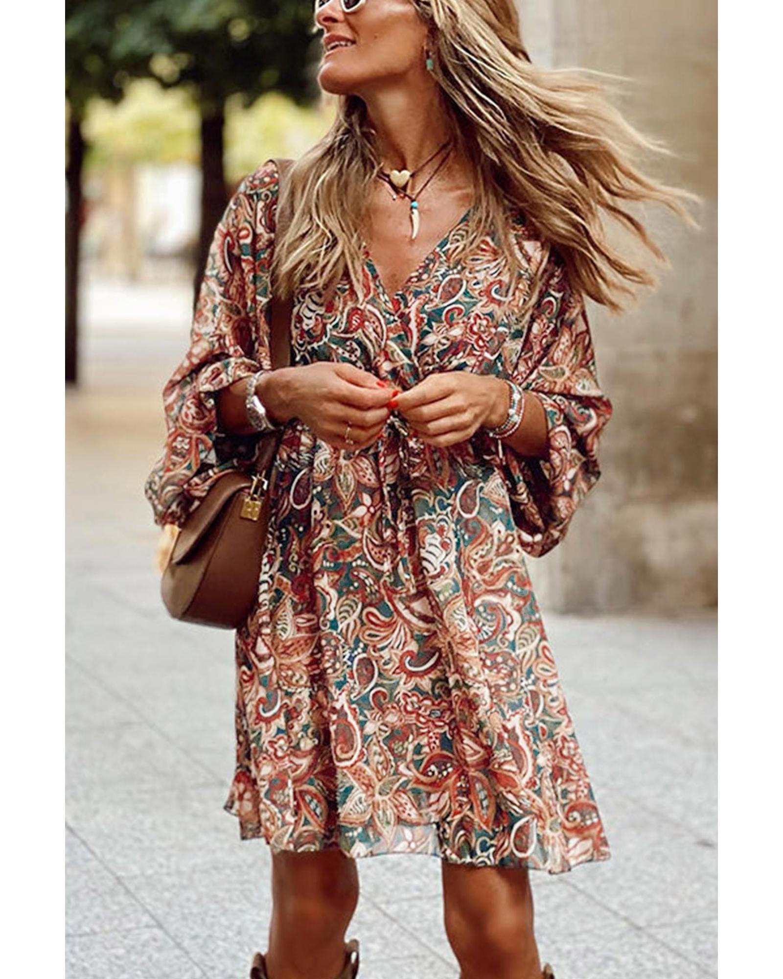 Brown Geometric Print Long Sleeve Surplice Flowy Dress – M