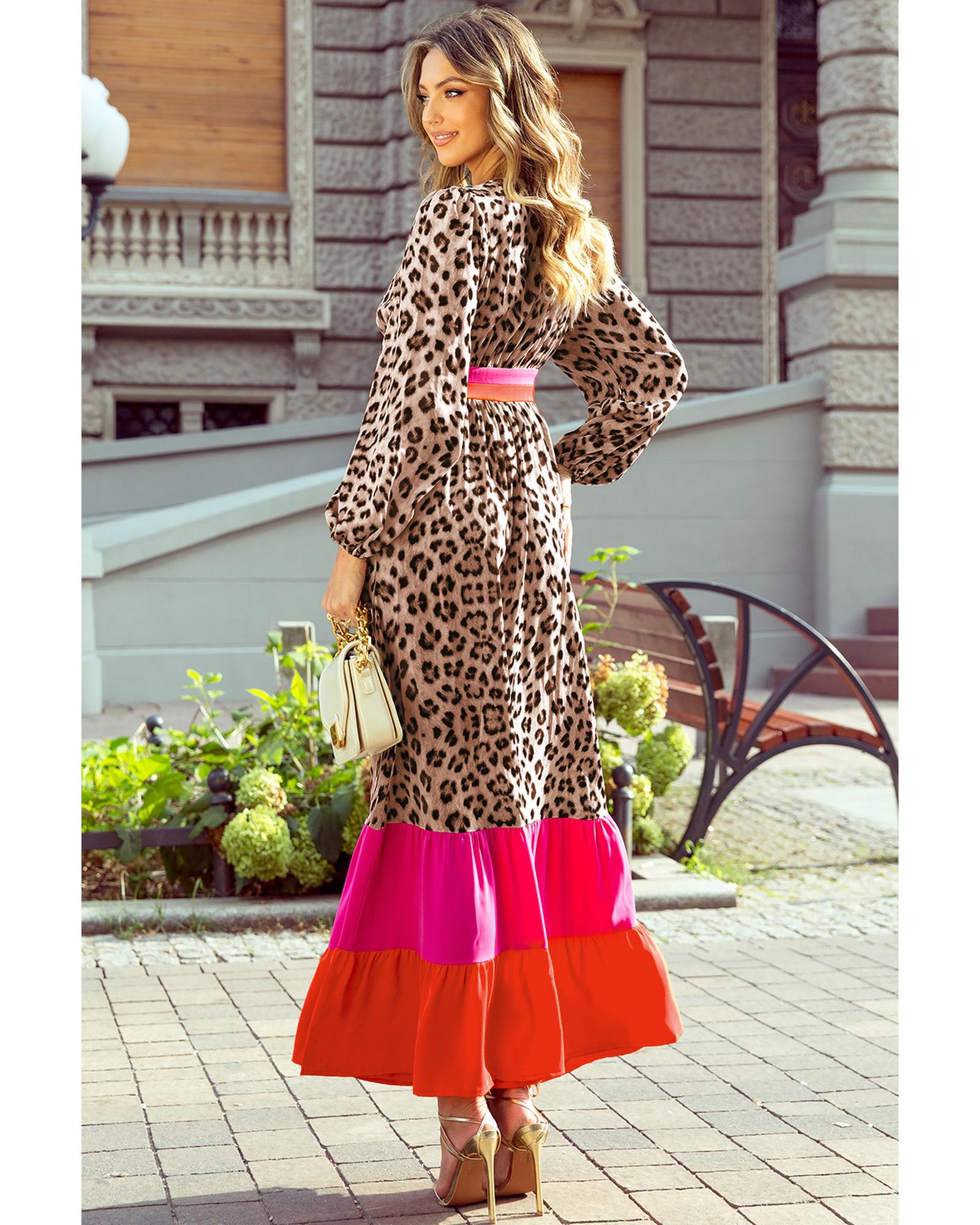 Brown Leopard Color Block V Neck Loose Fit Maxi Dress – M