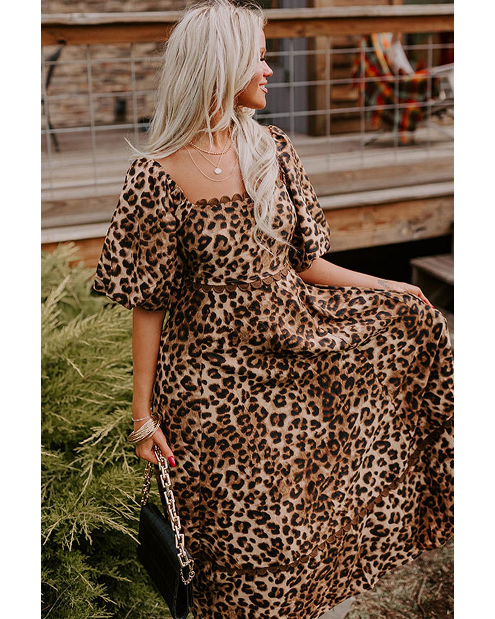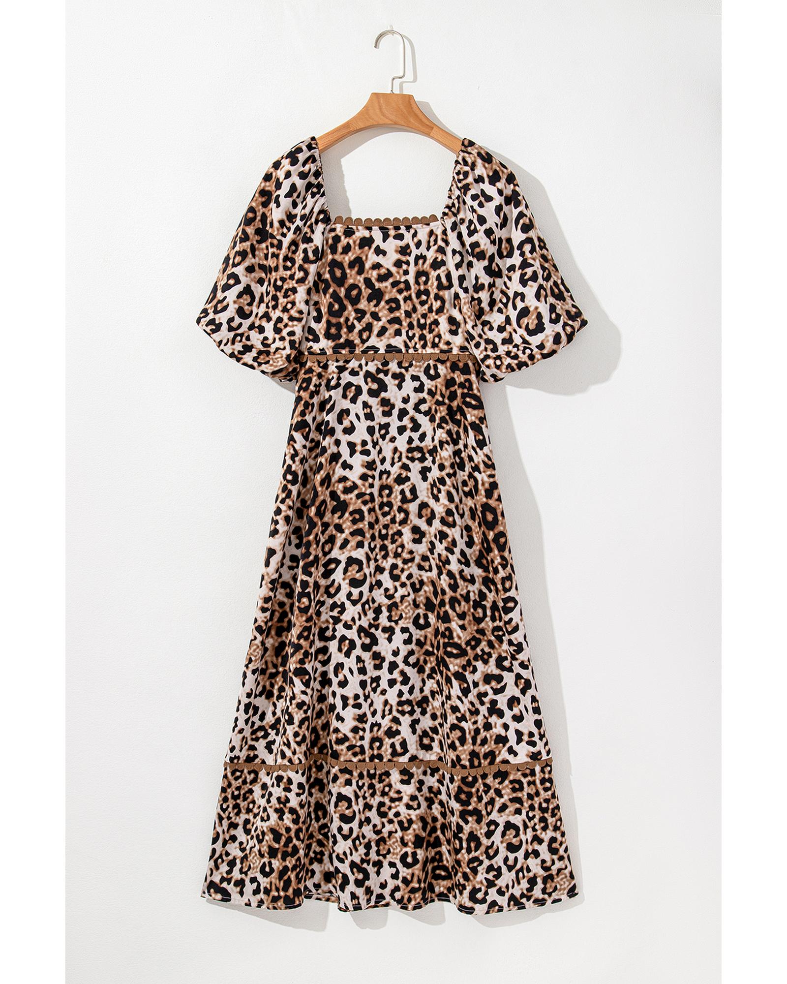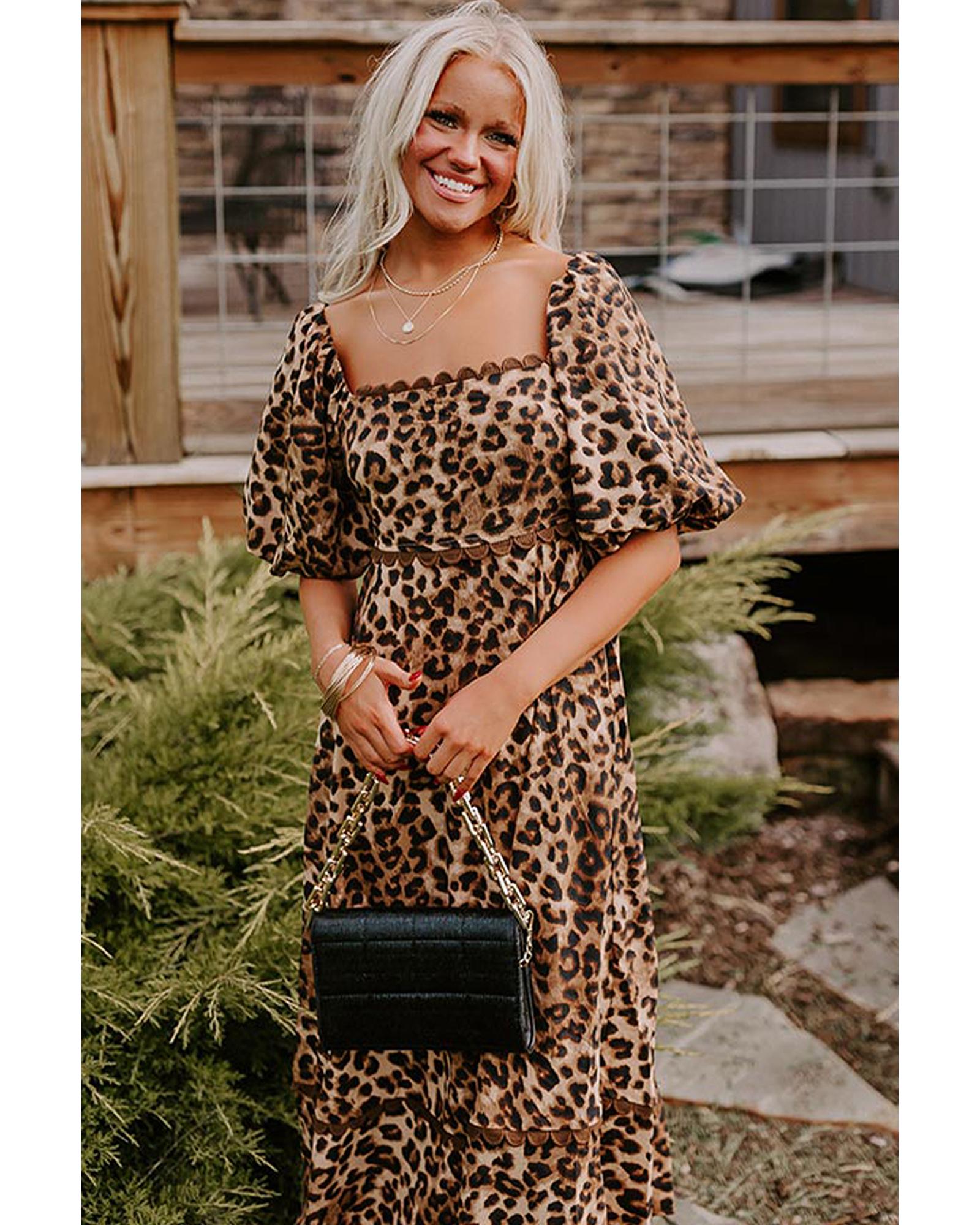 - Brown Leopard Print Bubble Sleeve Square Neck Maxi Dress