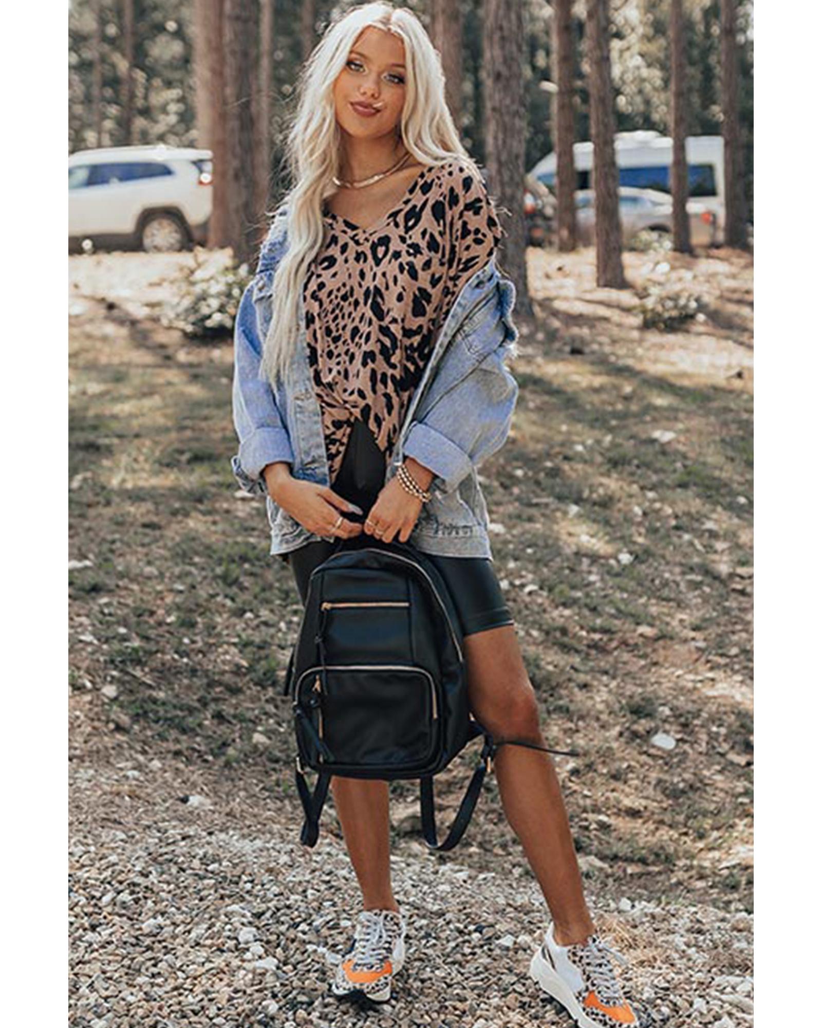 Brown Leopard Print V Neck Half Sleeve Oversized Tee – S