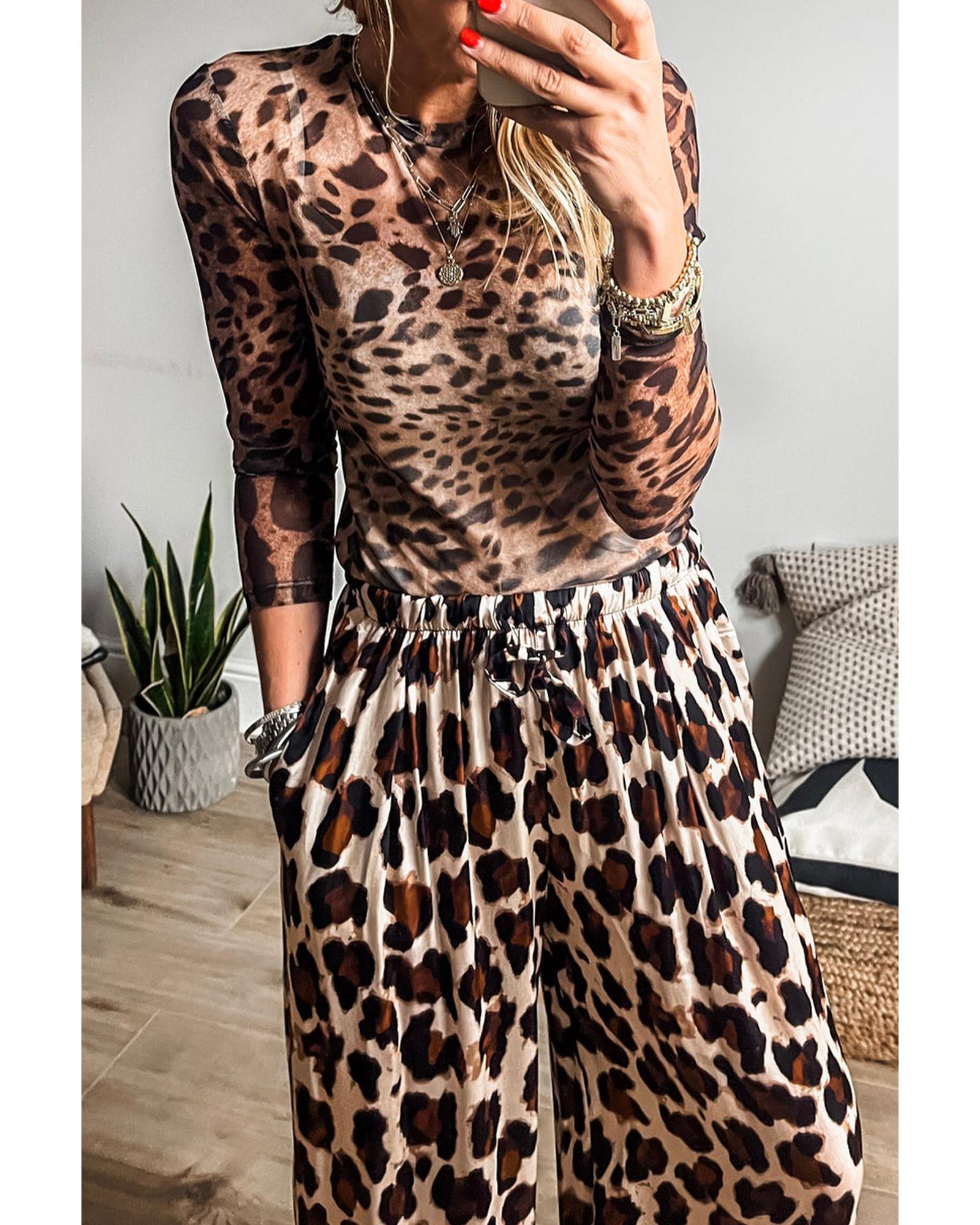 Brown Leopard Round Neck Long Sleeve Slim Top – XL