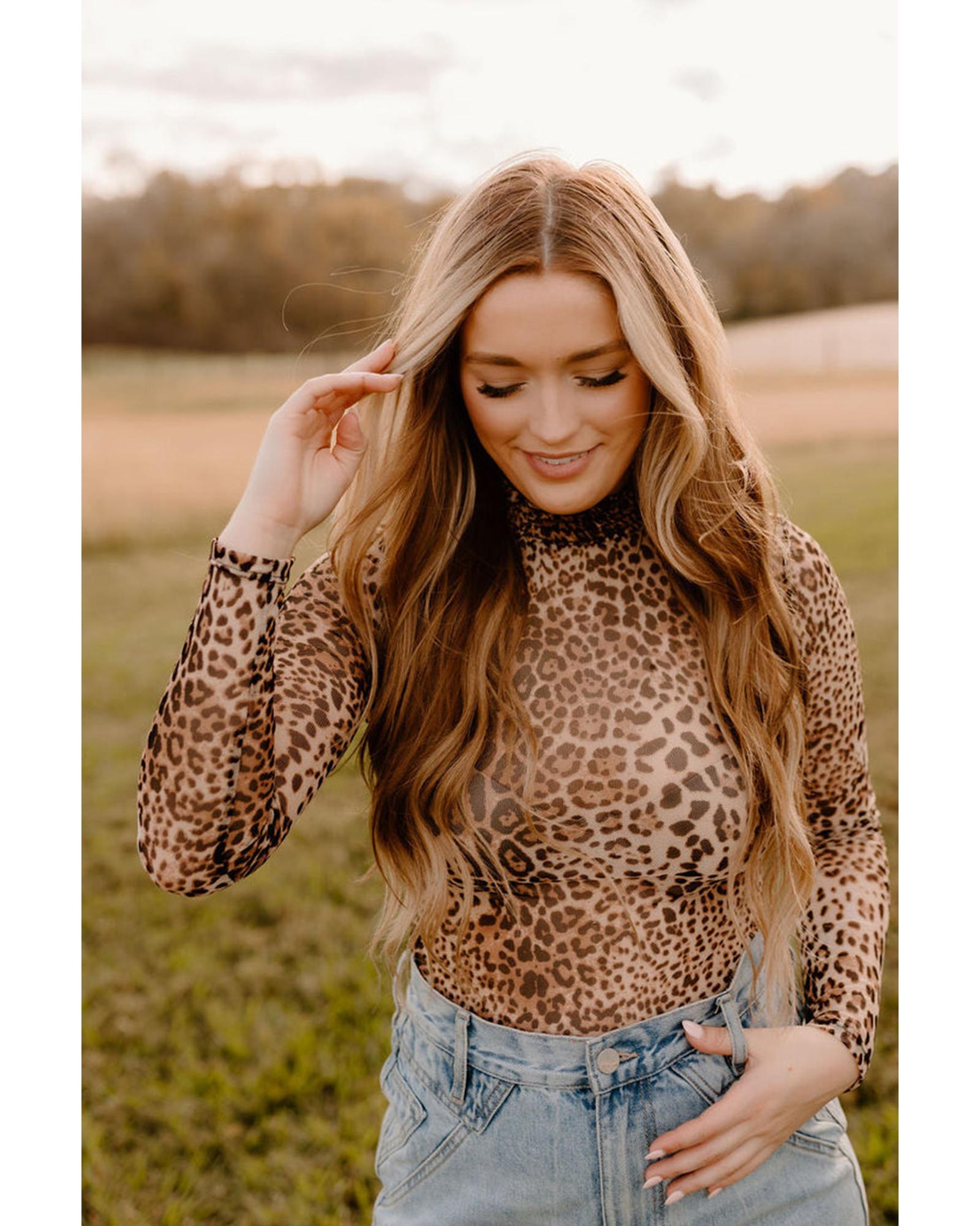 - Brown Leopard Smocked Neck Mesh Long Sleeve Bodysuit