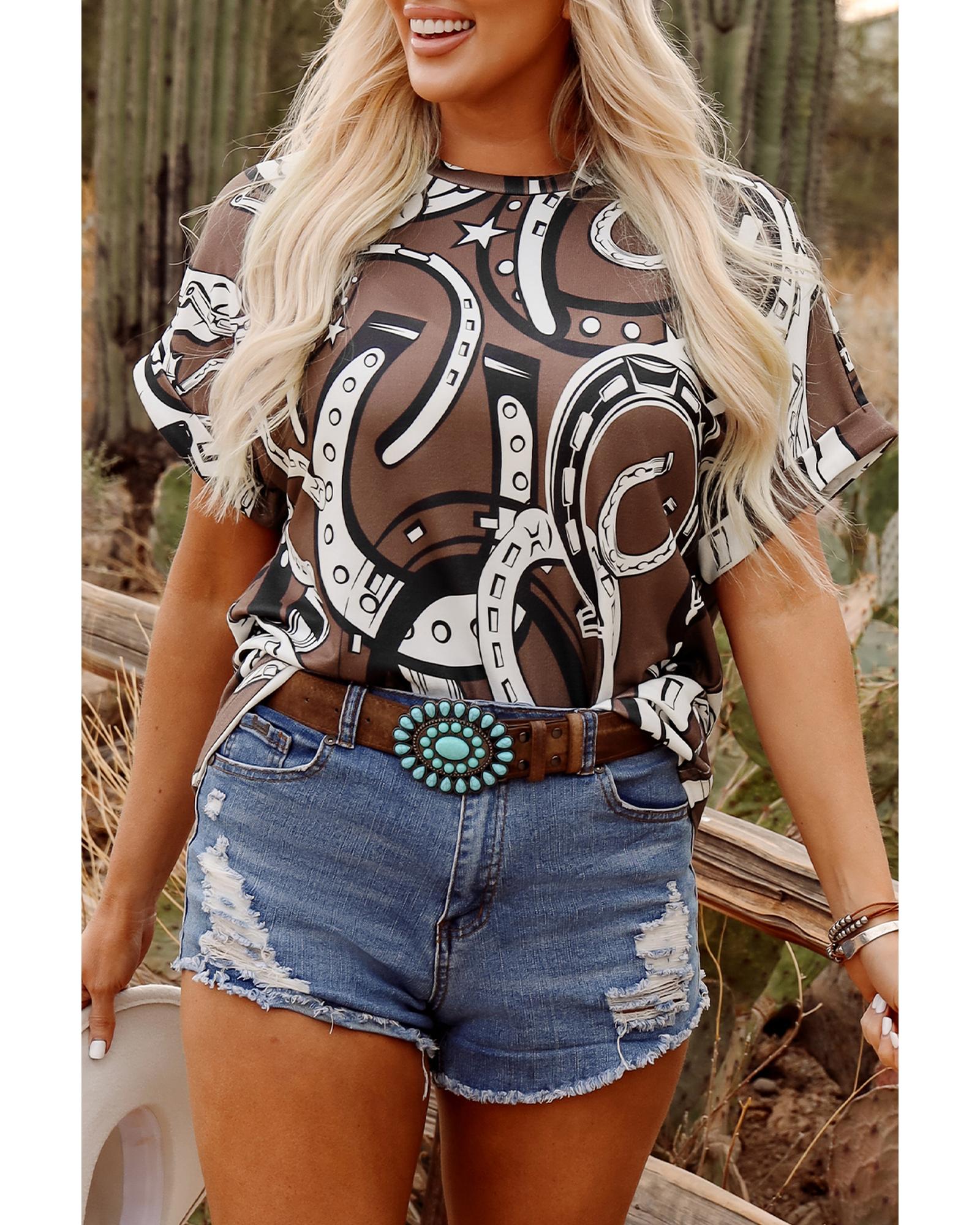 Brown Lucky Horseshoes Graphic Dolman T-shirt – S