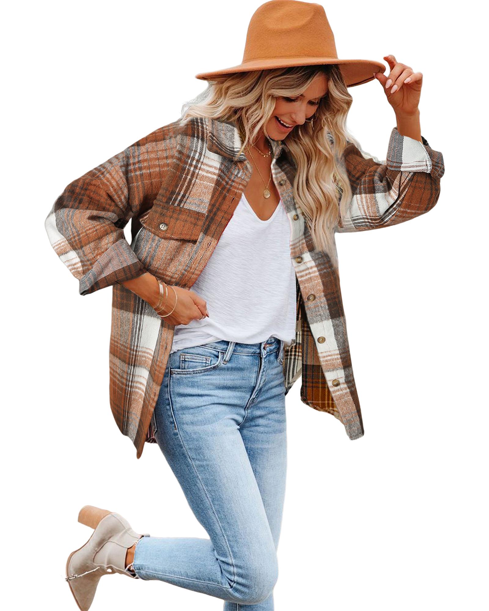 Brown Plaid Flap Pockets Shacket – M