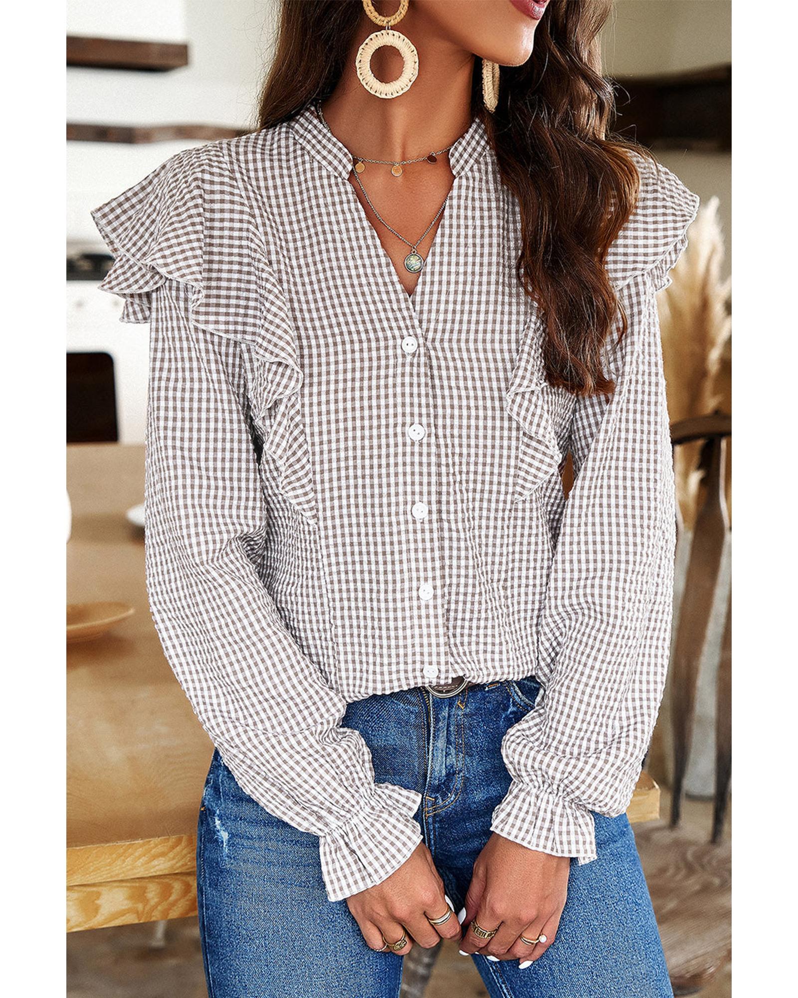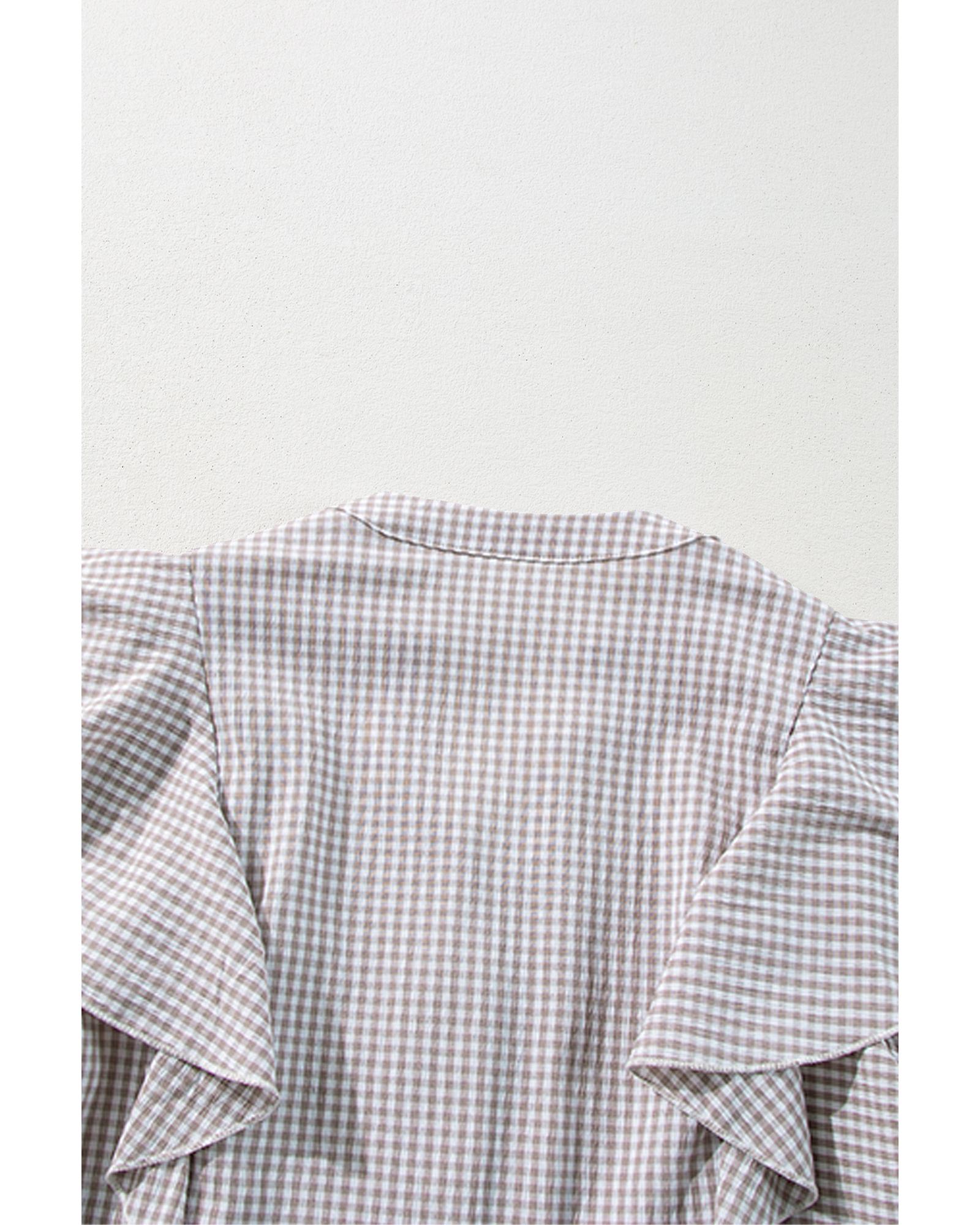 Brown Plaid Flounce Sleeve Notched Neck Ruffled Shirt – L
