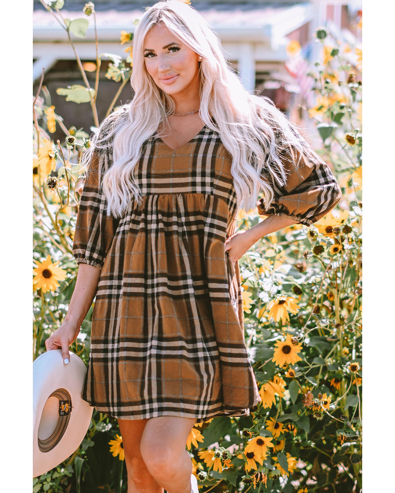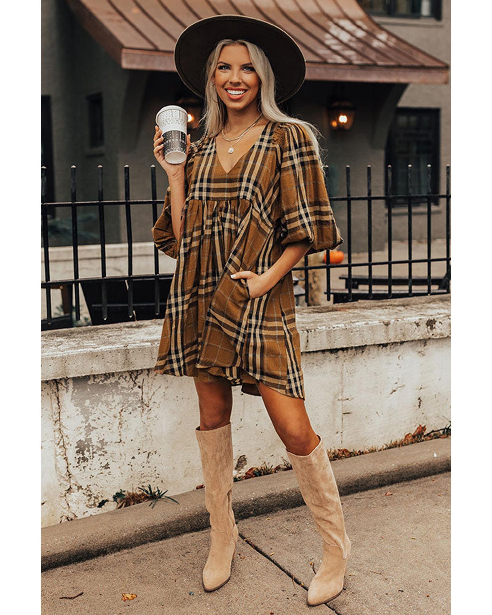 Brown Plaid Pattern Empire Waist Babydoll Dress – M
