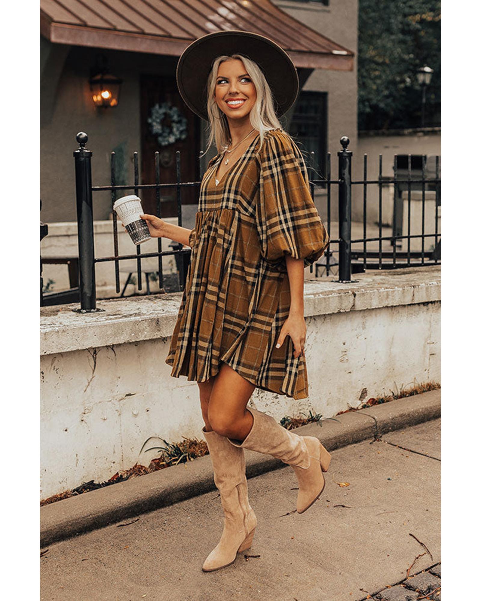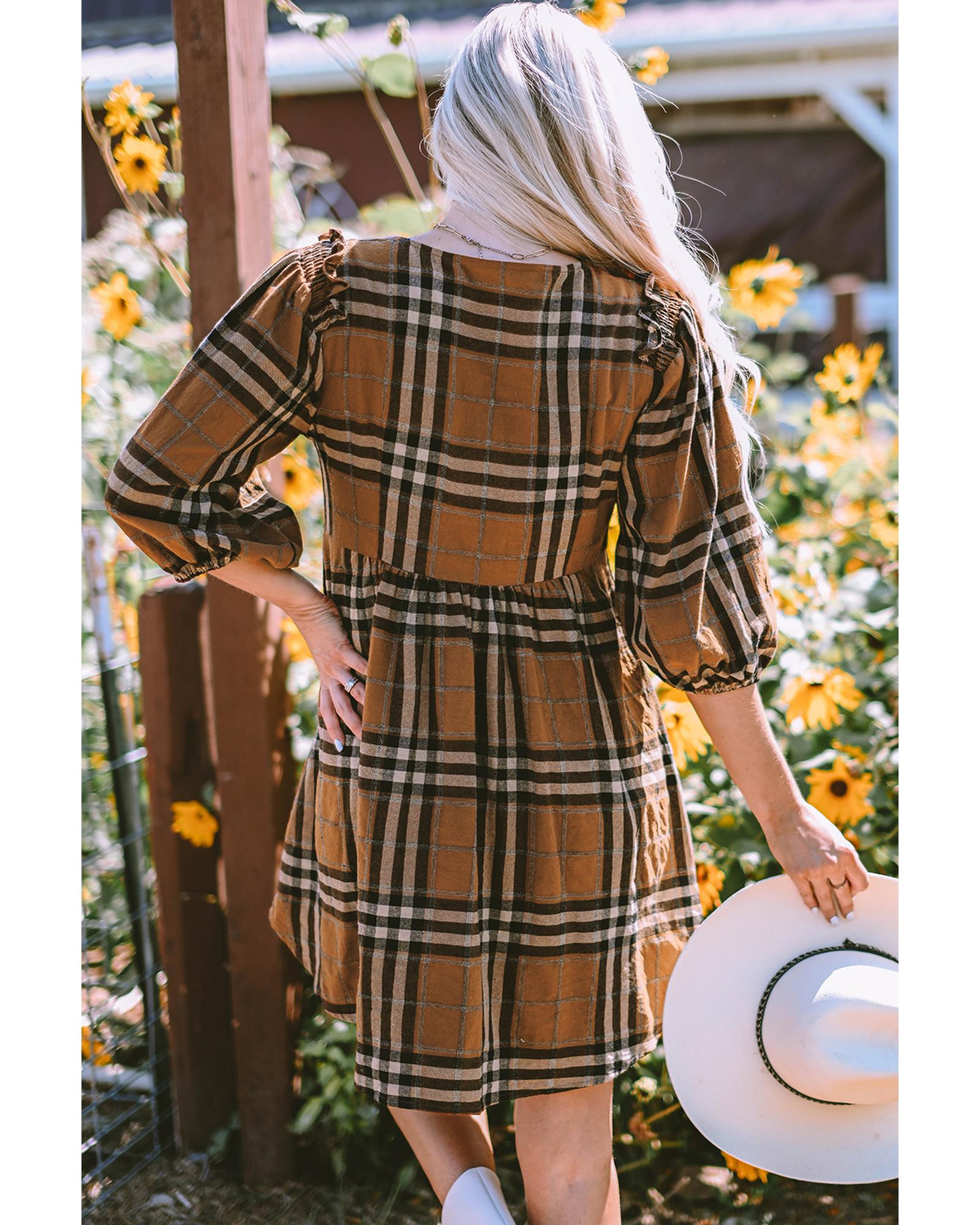 Brown Plaid Pattern Empire Waist Babydoll Dress – S