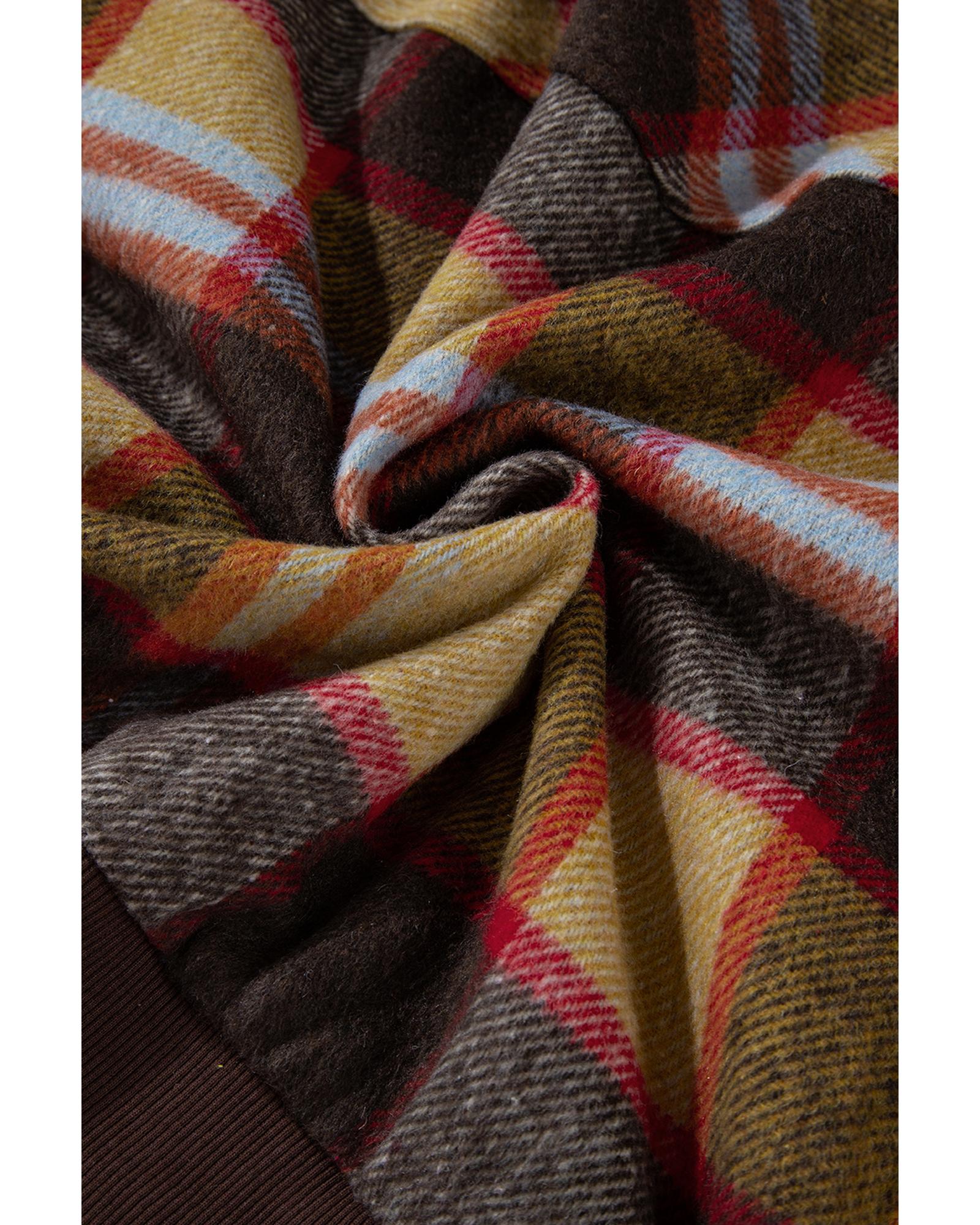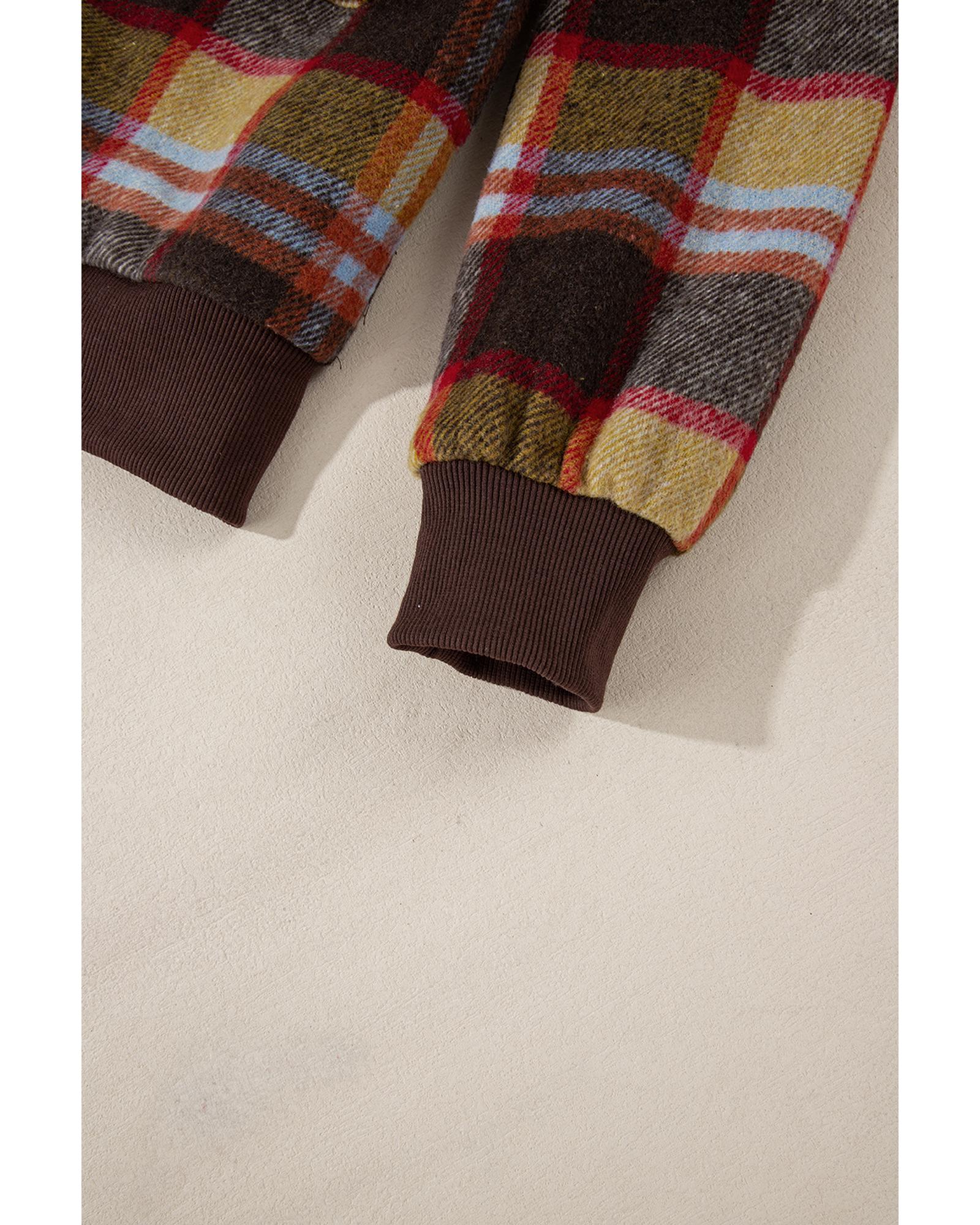 Brown Plaid Print Chest Pockets Button Zipper Stand Neck Jacket – S