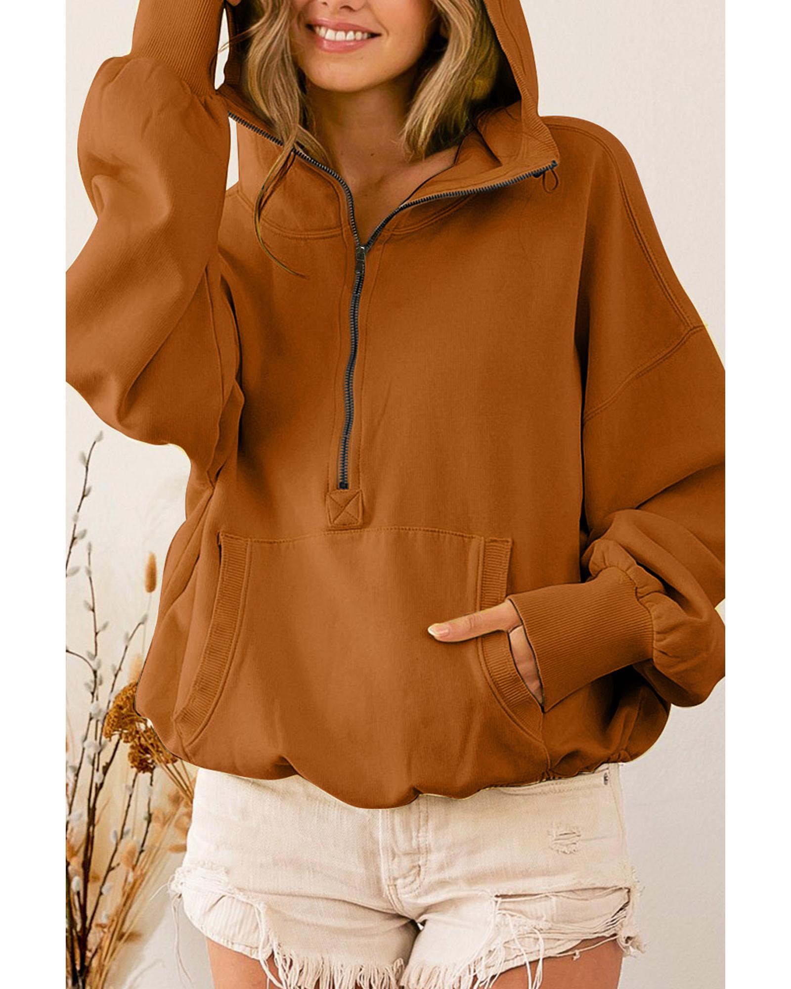 Brown Ribbed Trim Kangaroo Pocket Zipped Hoodie – L
