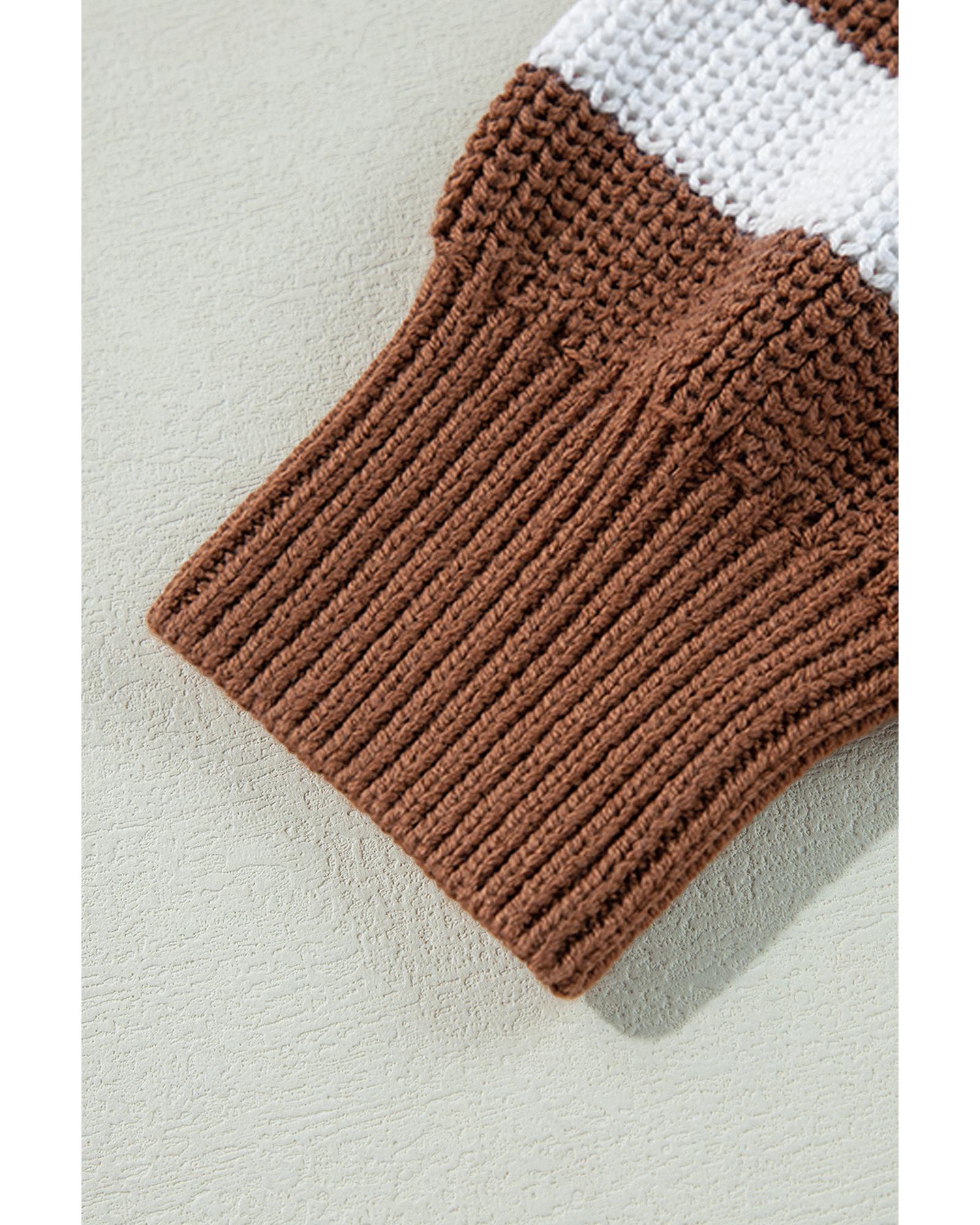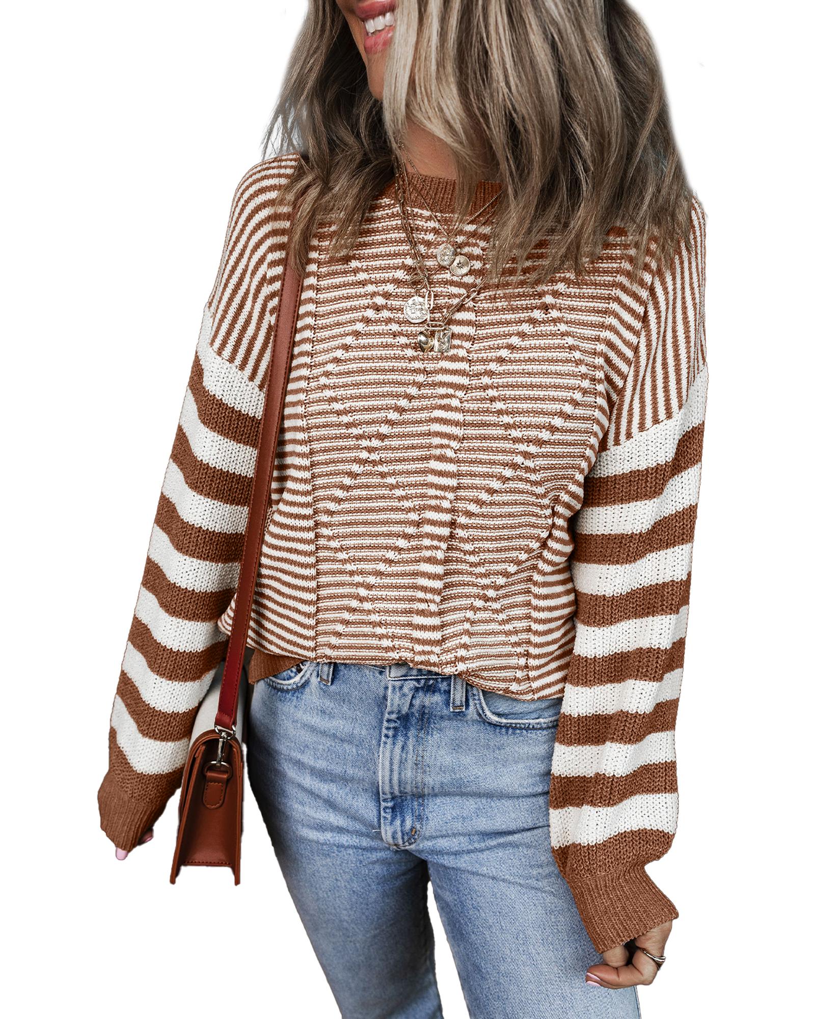 • Brown Stripe Geometric Textured Drop Shoulder Sweater