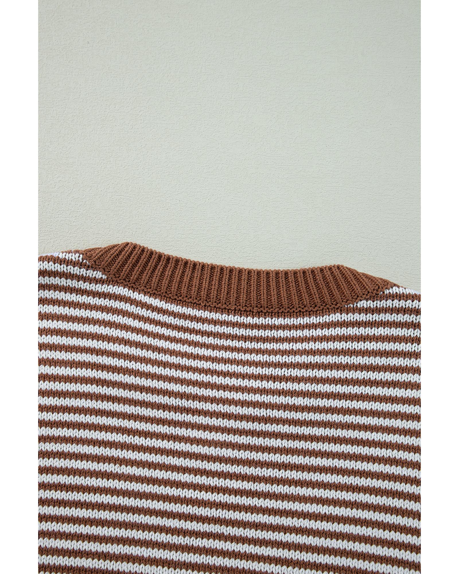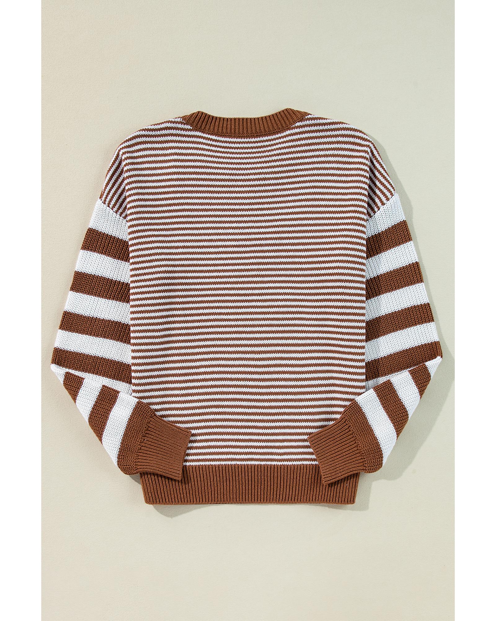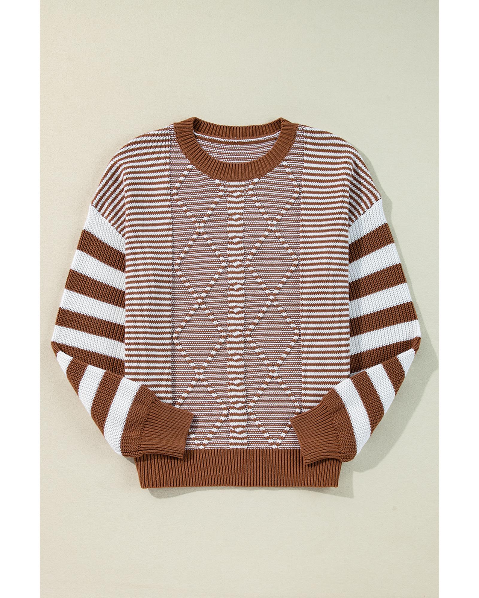 - Brown Stripe Geometric Textured Drop Shoulder Sweater
