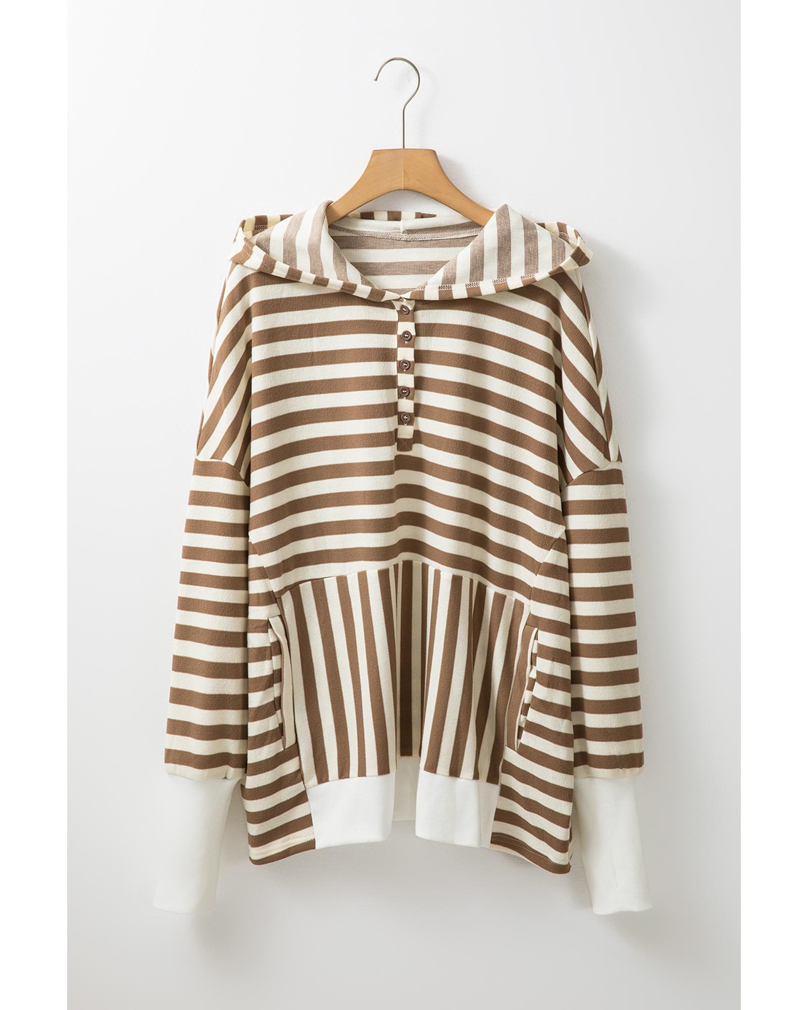 Brown Stripe Quarter Buttons Drop Sleeve Plus Size Hoodie – 2X