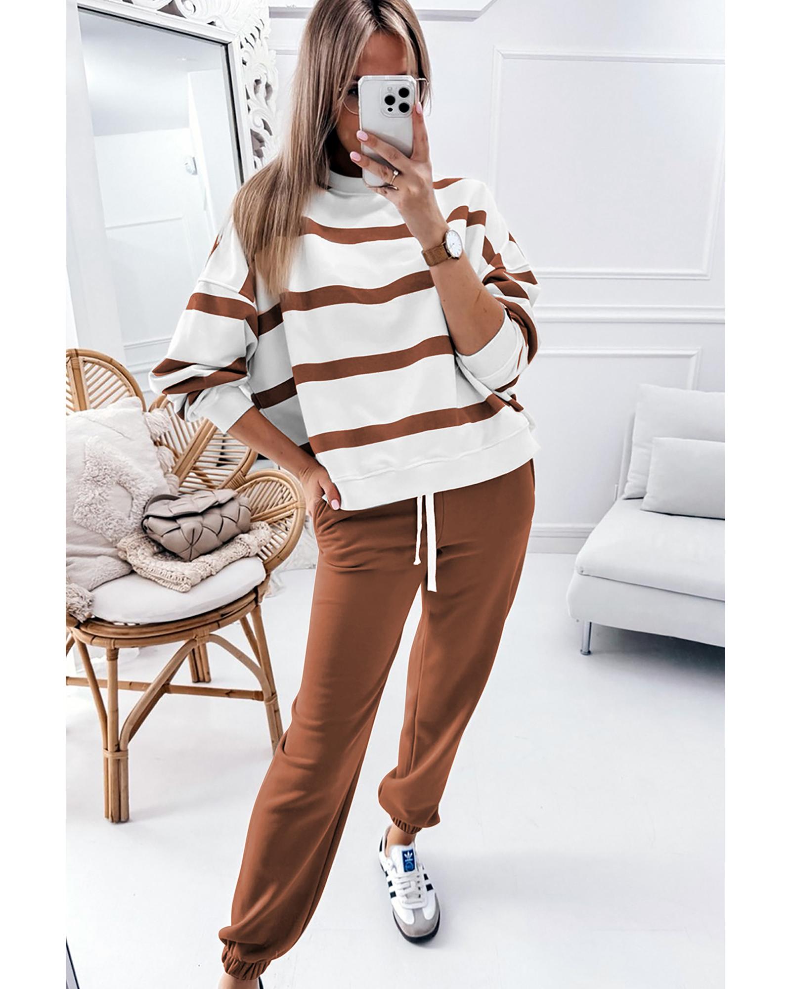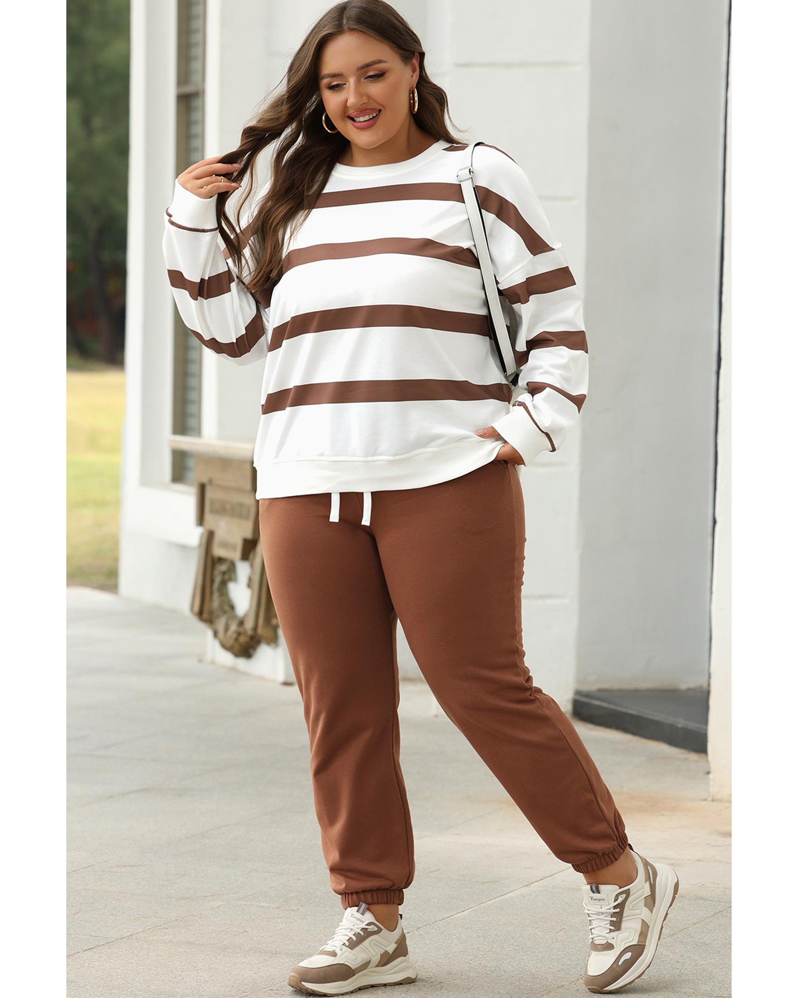 Brown Stripe Striped Drop Shoulder Pullover and Jogger Pants Set – 2XL