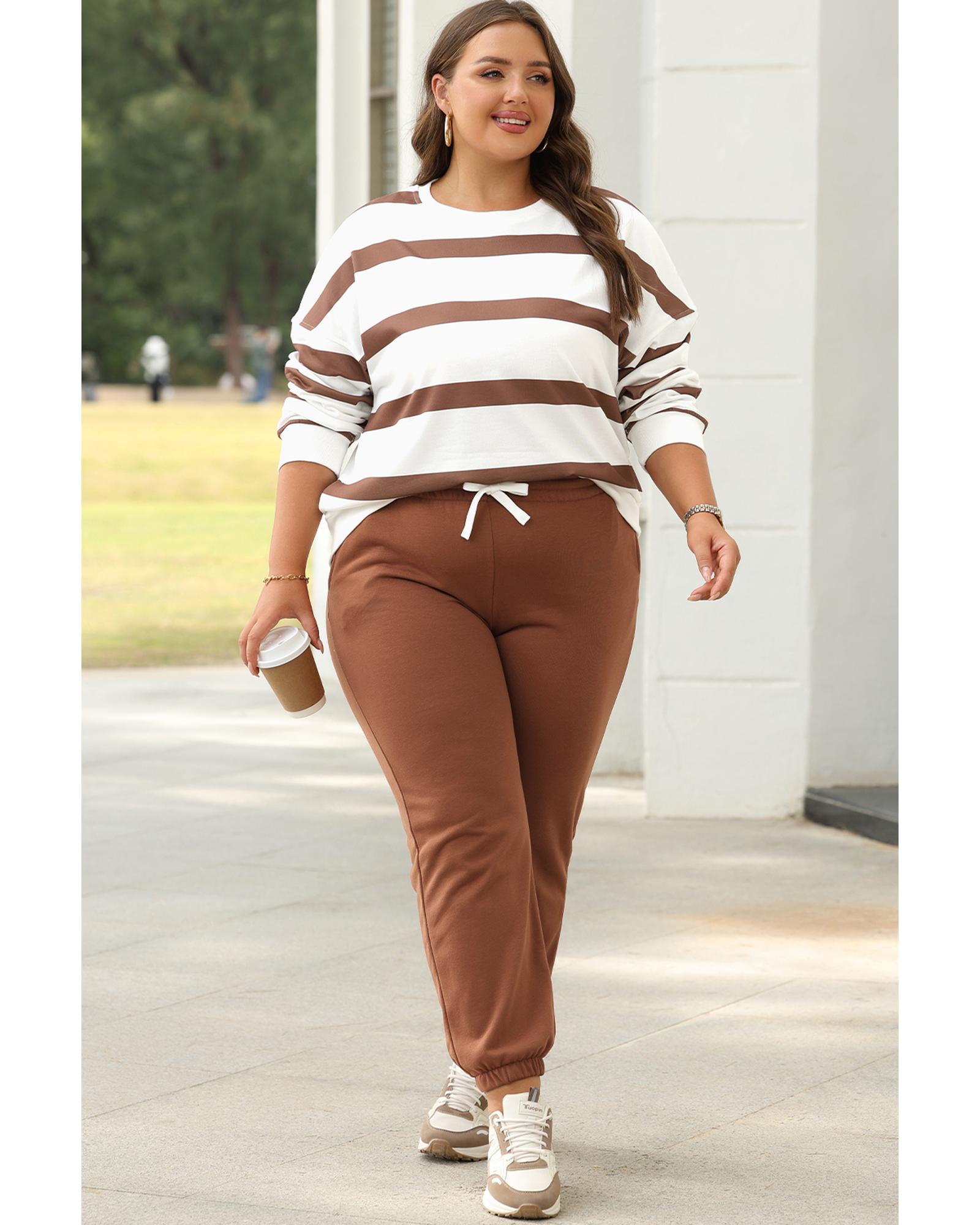 Brown Stripe Striped Drop Shoulder Pullover and Jogger Pants Set – M