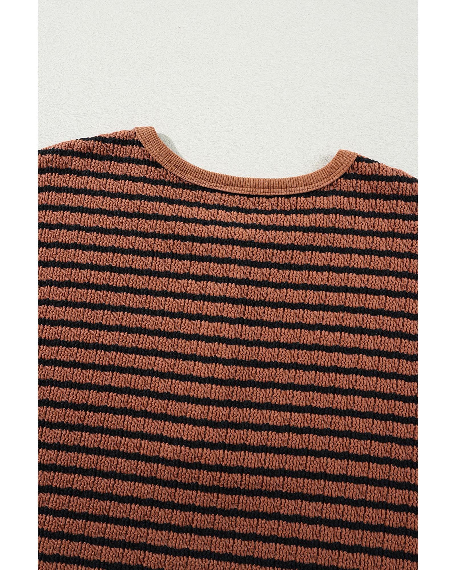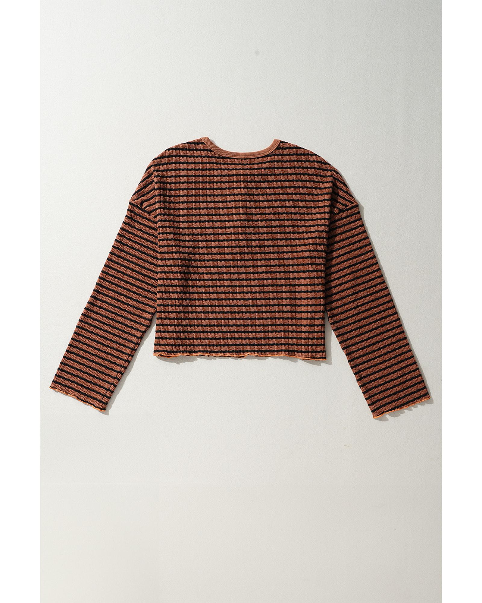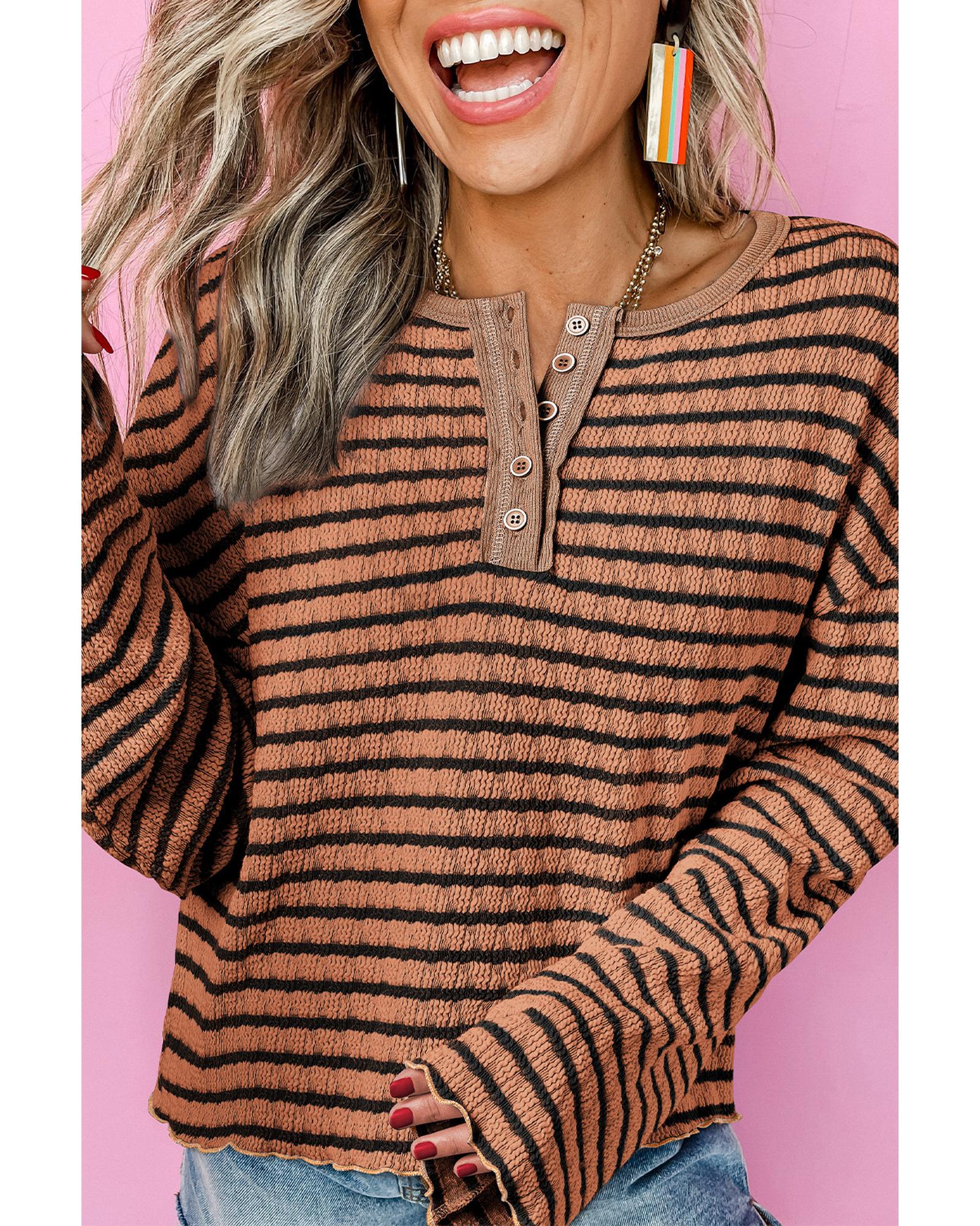 • Brown Stripe Textured Frilly Trim Buttons Henley Long Sleeve Top