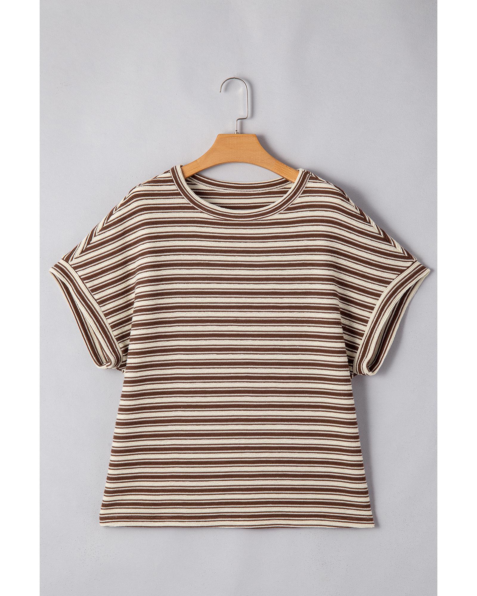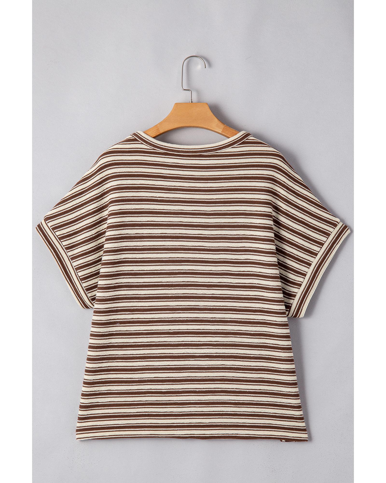 Brown Stripe Textured Side Slits Crew Neck T Shirt – M