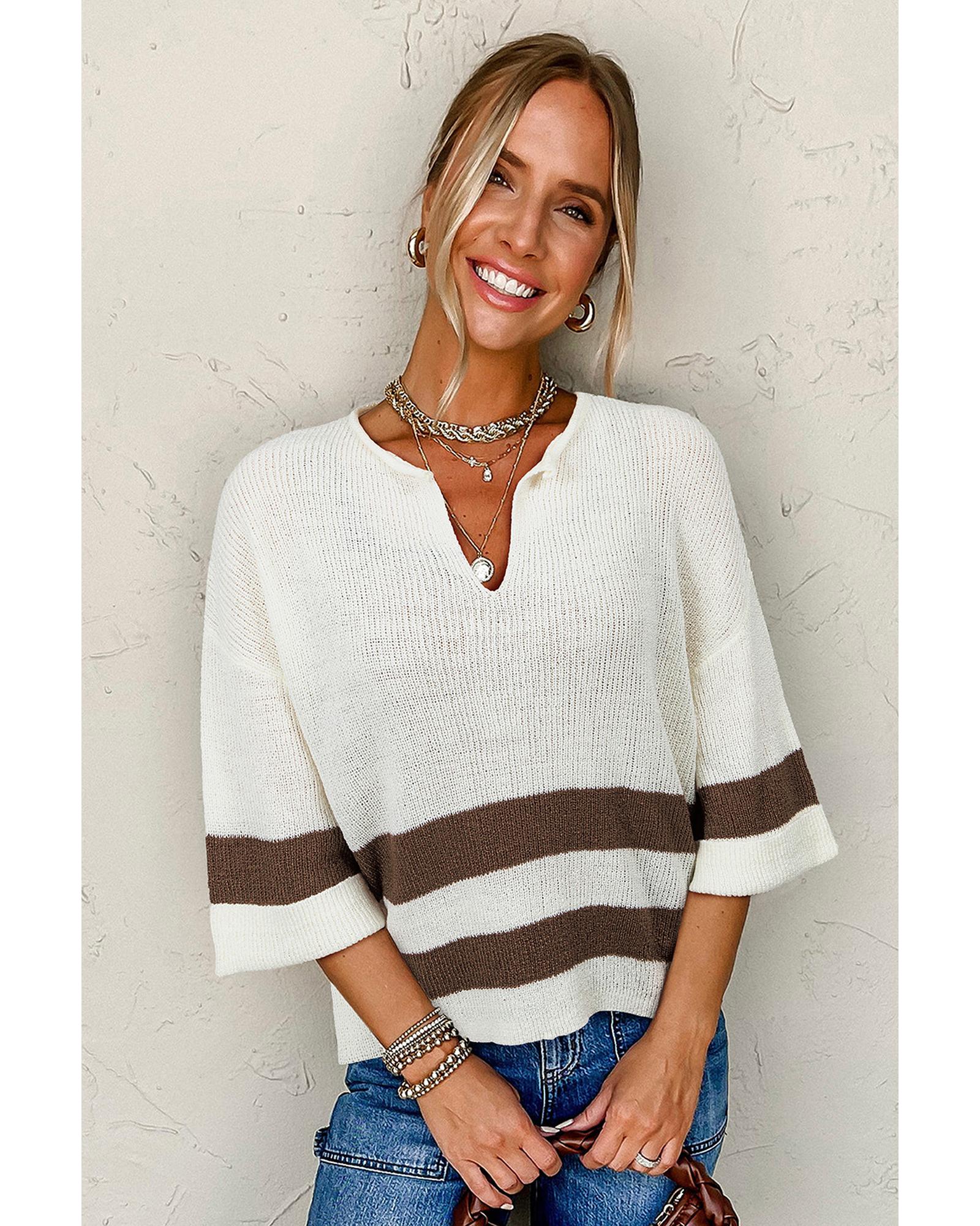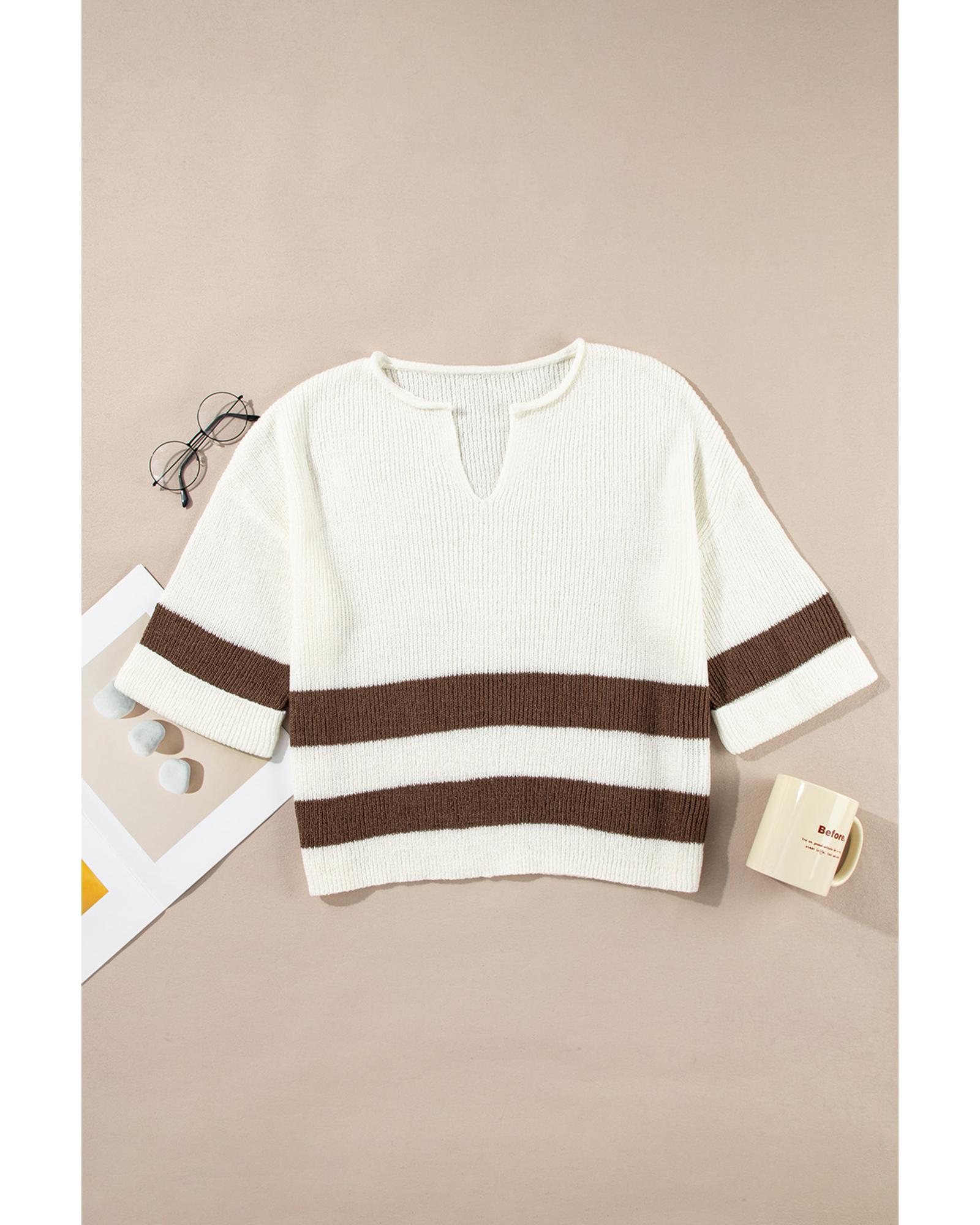 - Brown Striped Accent Notched V Neck Cropped Sweater T Shirt