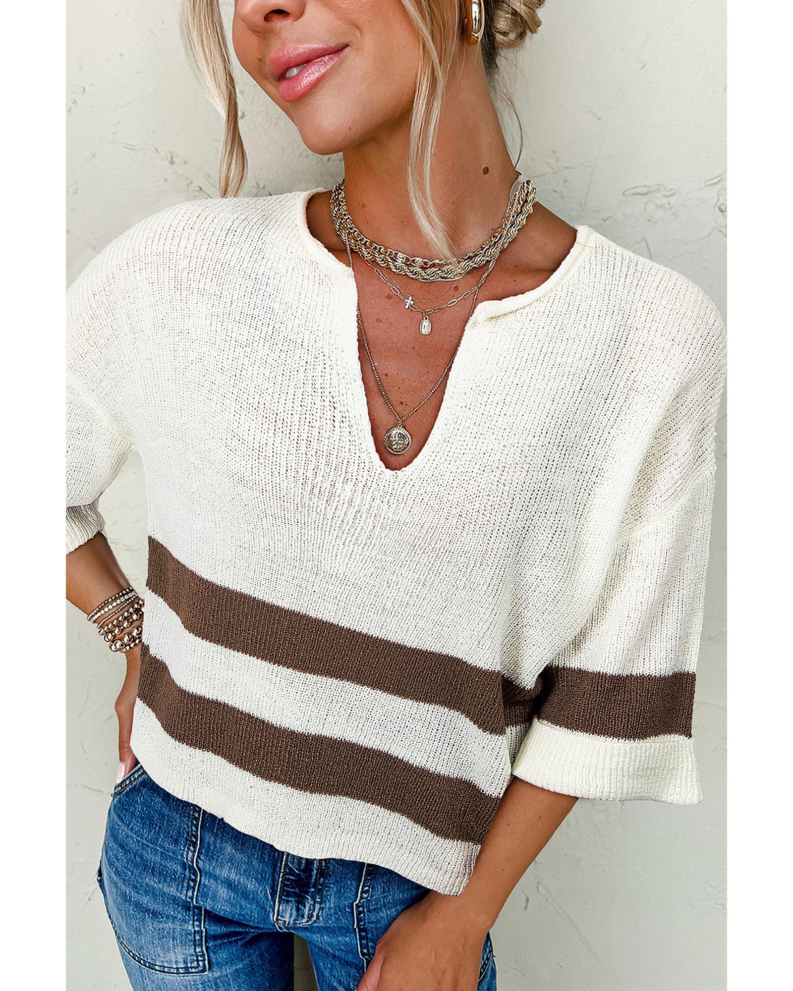 - Brown Striped Accent Notched V Neck Cropped Sweater T Shirt