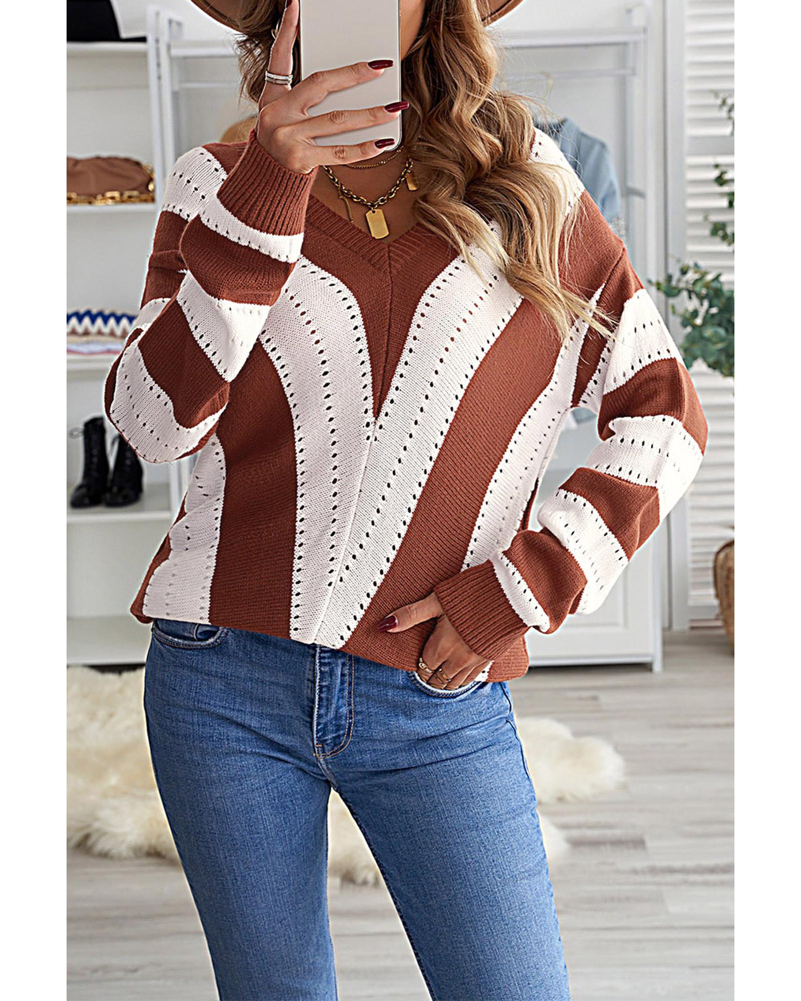 • Brown Striped Colorblock V Neck Knitted Sweater