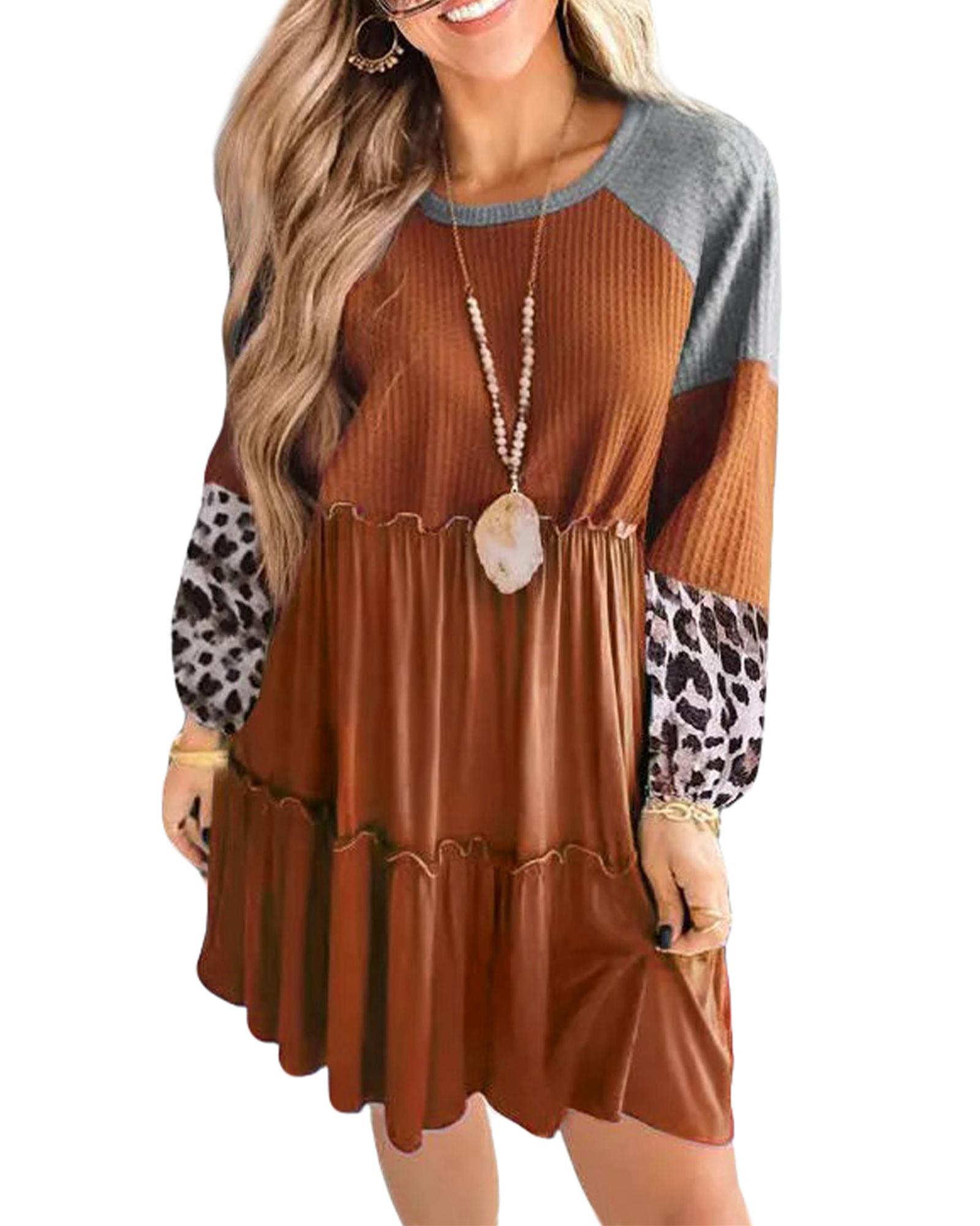 Brown Waffle Knit Leopard Patchwork Long Sleeve Dress – M