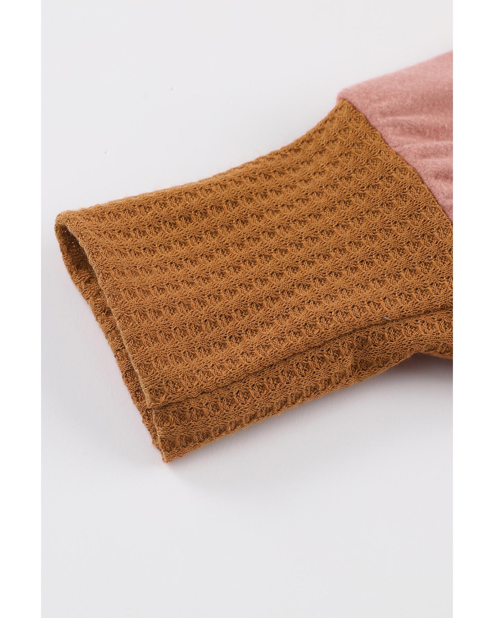 Brown Waffle Knit Patchwork Drawstring V Neck Hoodie – XL