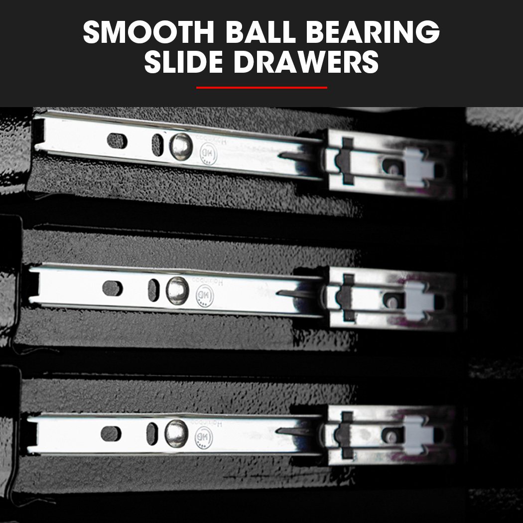 Both the cabinet and chest are built with high tensile powder coated steel enclosures. Equipped with an EVA mat, each drawer slides effortlessly in and out on smooth ball bearing rails, which makes finding and accessing each tool a cinch. The cabinet also comes with 3 pegs and the chest is easily transportable thanks to its side carry handles.