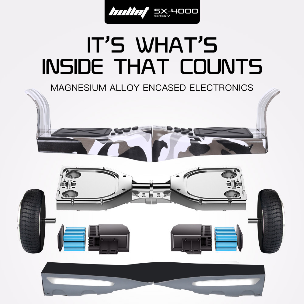 Experience a next level hoverboard with the state-of-the-art Bullet SX-4000. Its high-speed chipset reacts instantly to your bodys movements, offering highly responsive acceleration, turning, and reversing.