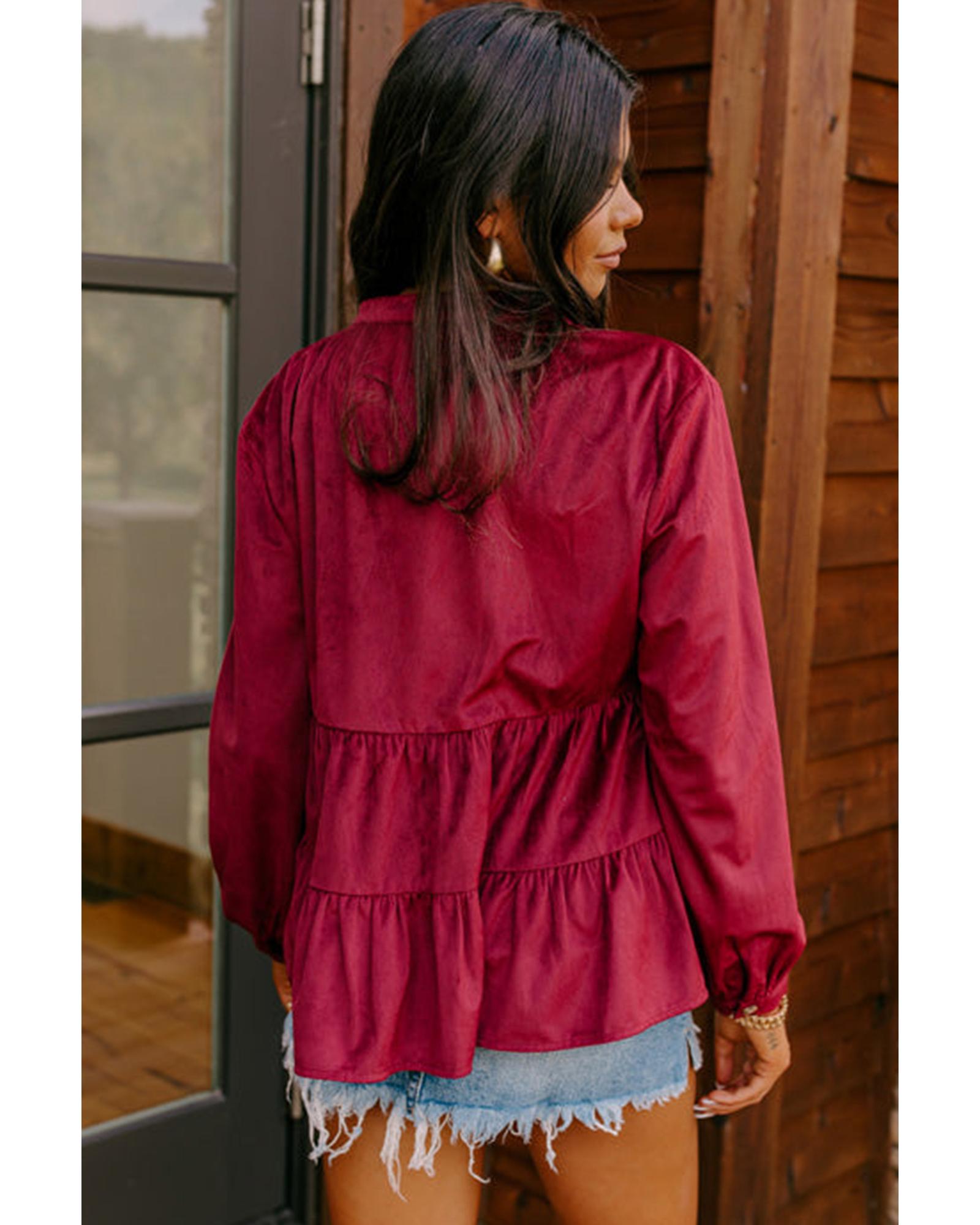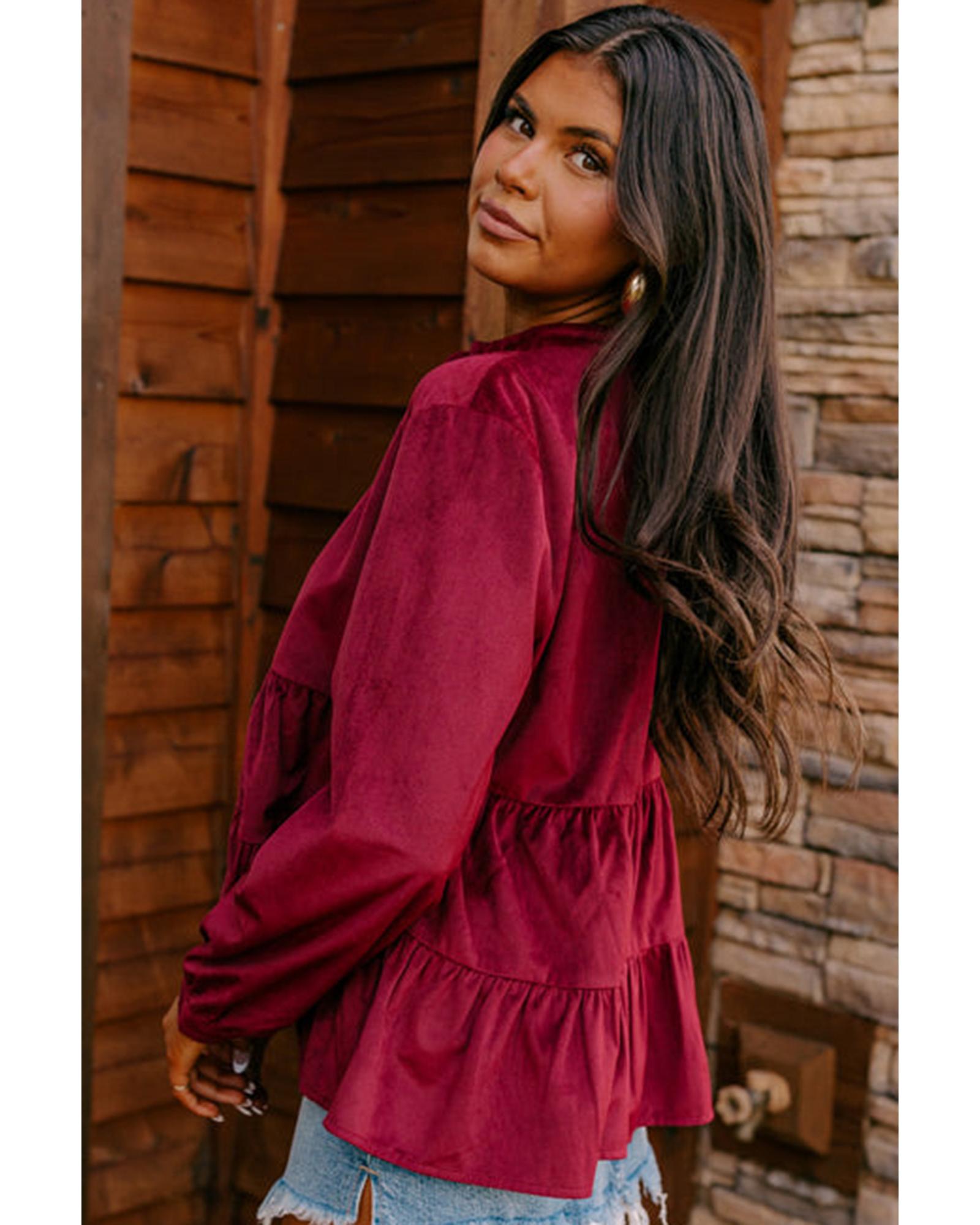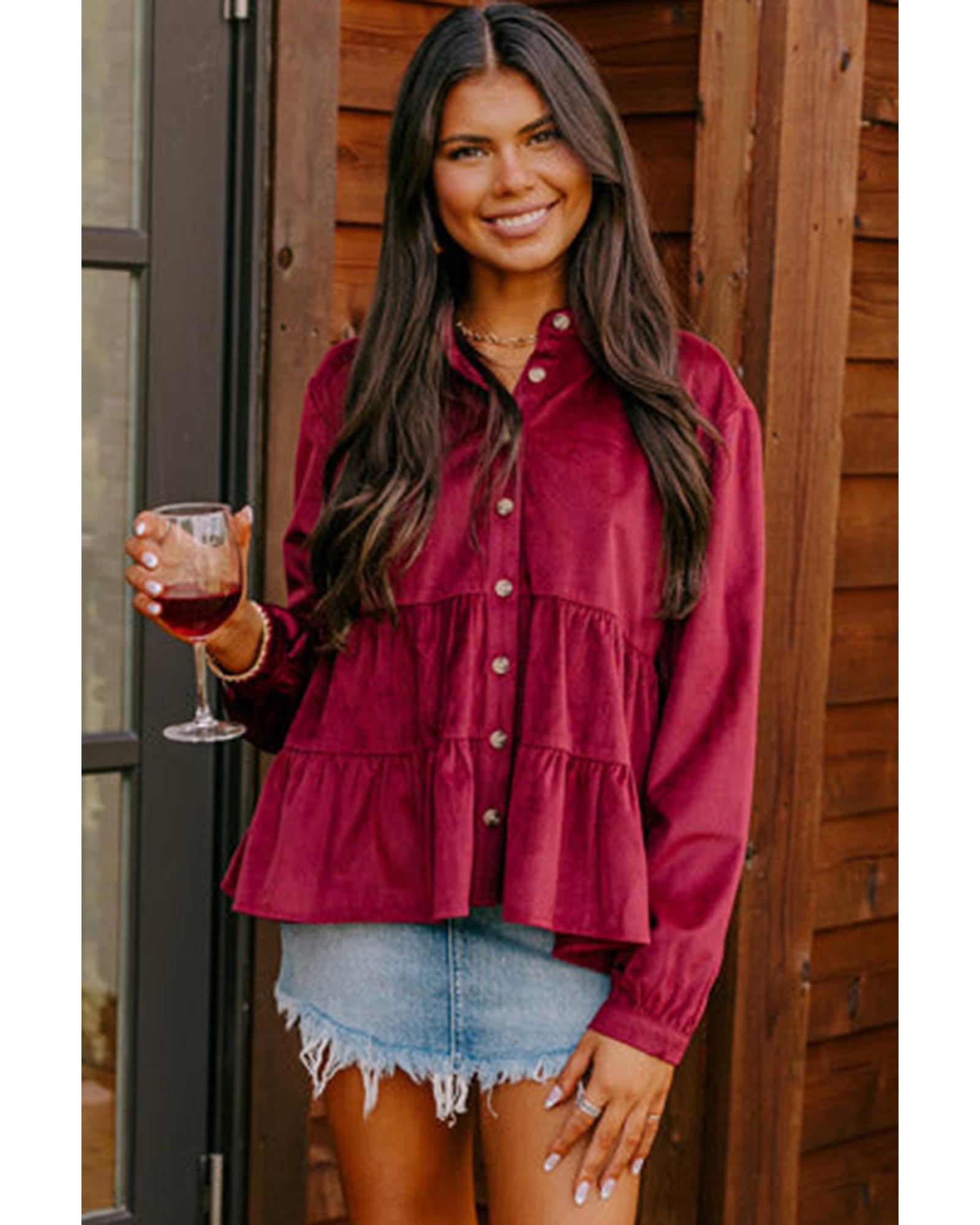 Burgundy Corduroy Ruffle Tiered Buttoned O Neck Shirt – XL