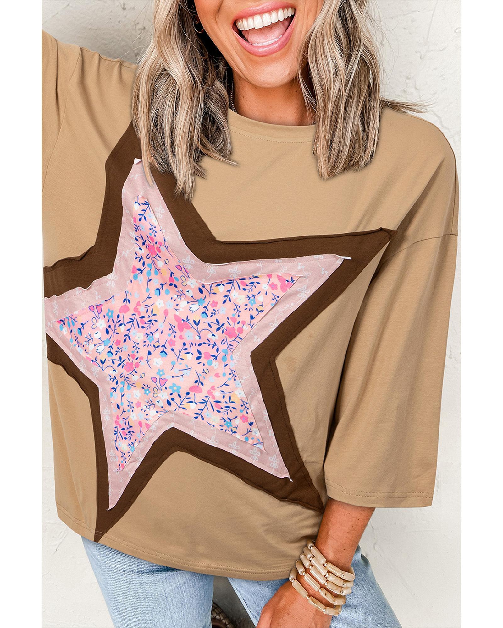 Camel Floral Star Patchwork 3/4 Long Sleeve Top – L