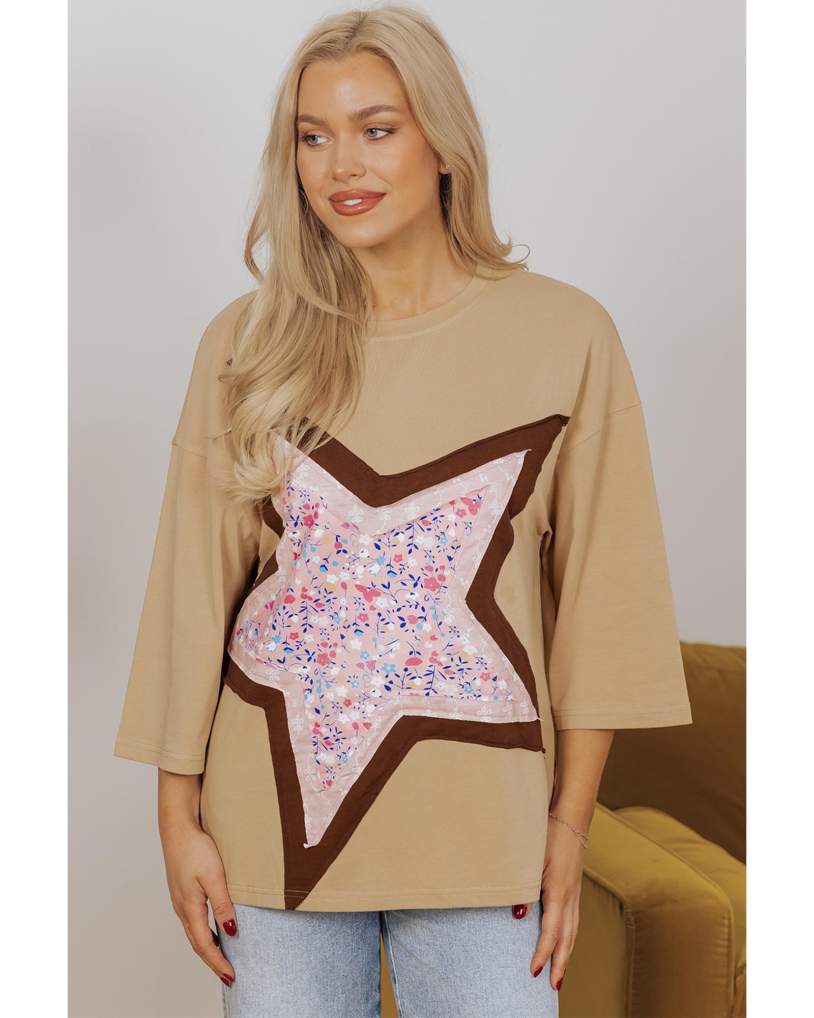 Camel Floral Star Patchwork 3/4 Long Sleeve Top – S