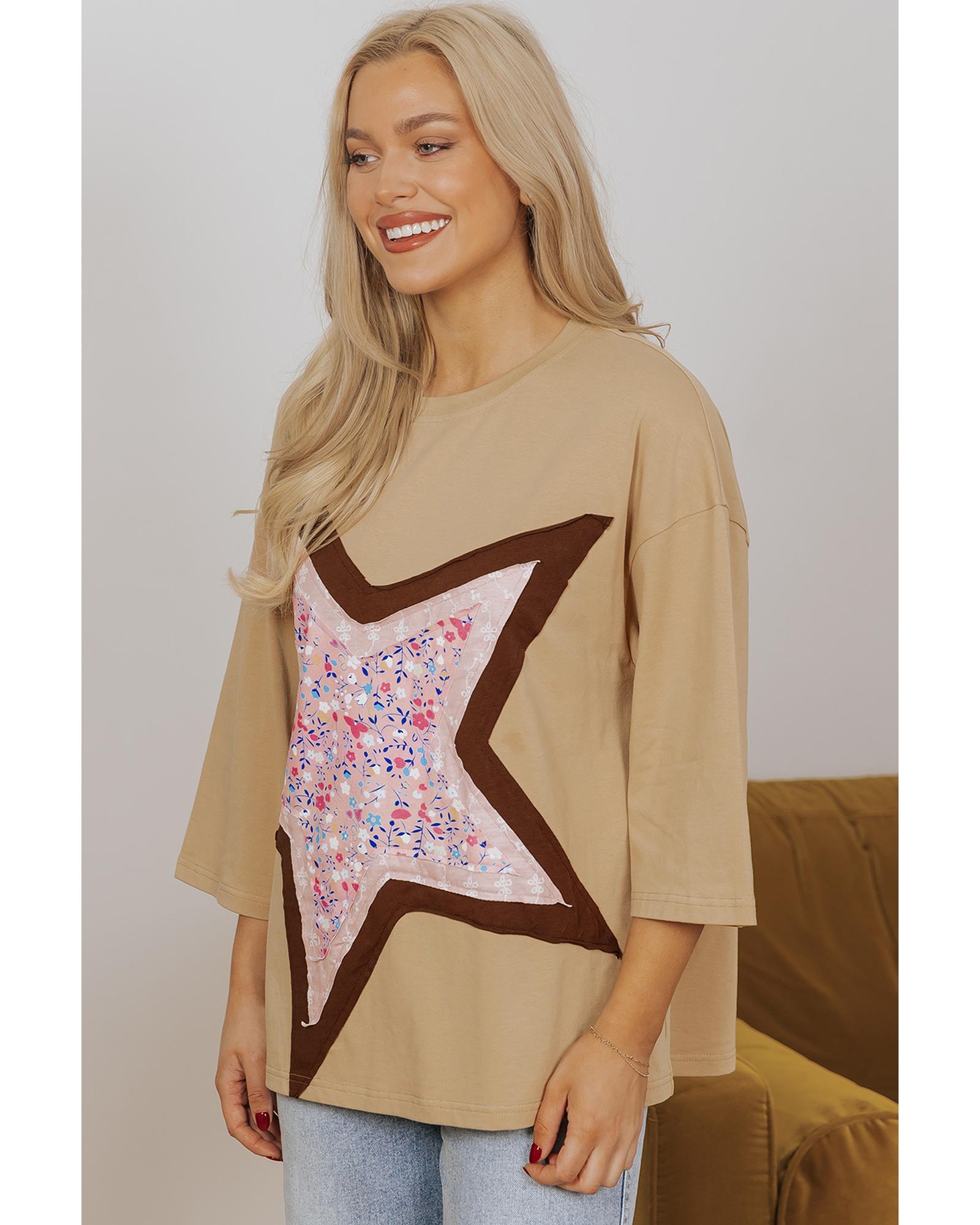 Camel Floral Star Patchwork 3/4 Long Sleeve Top – XL