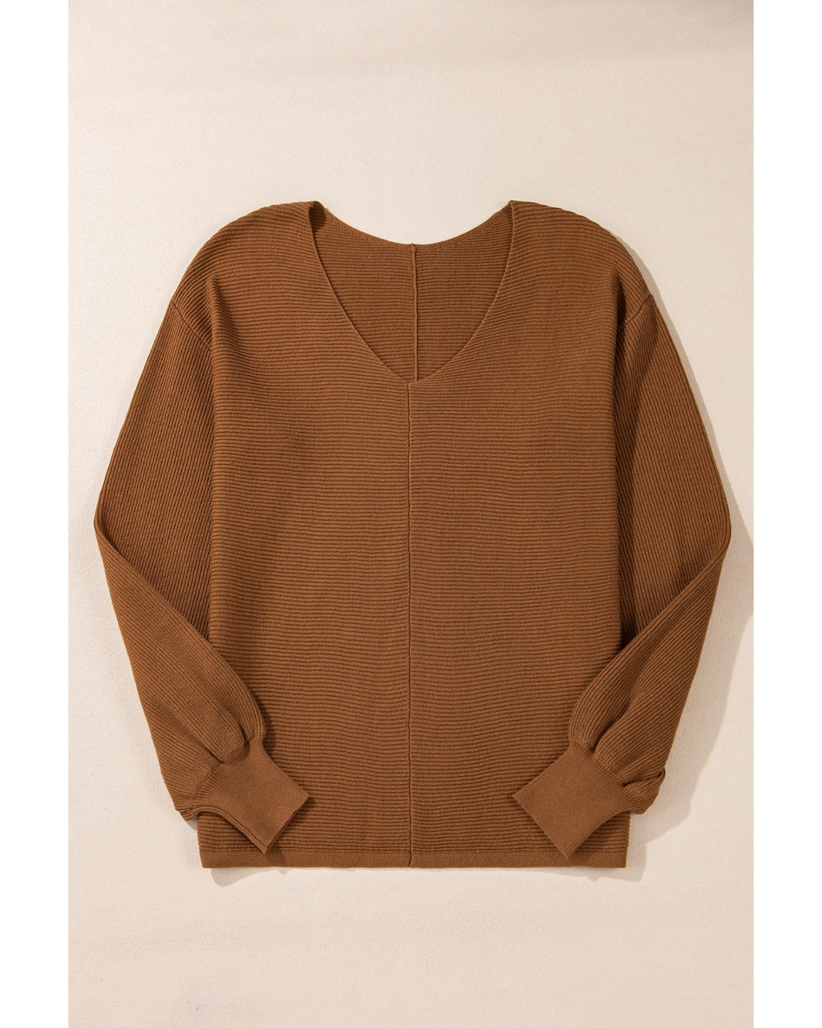 Camel Ribbed Knit Drop Sleeve V Neck Loose Fit Sweater – M