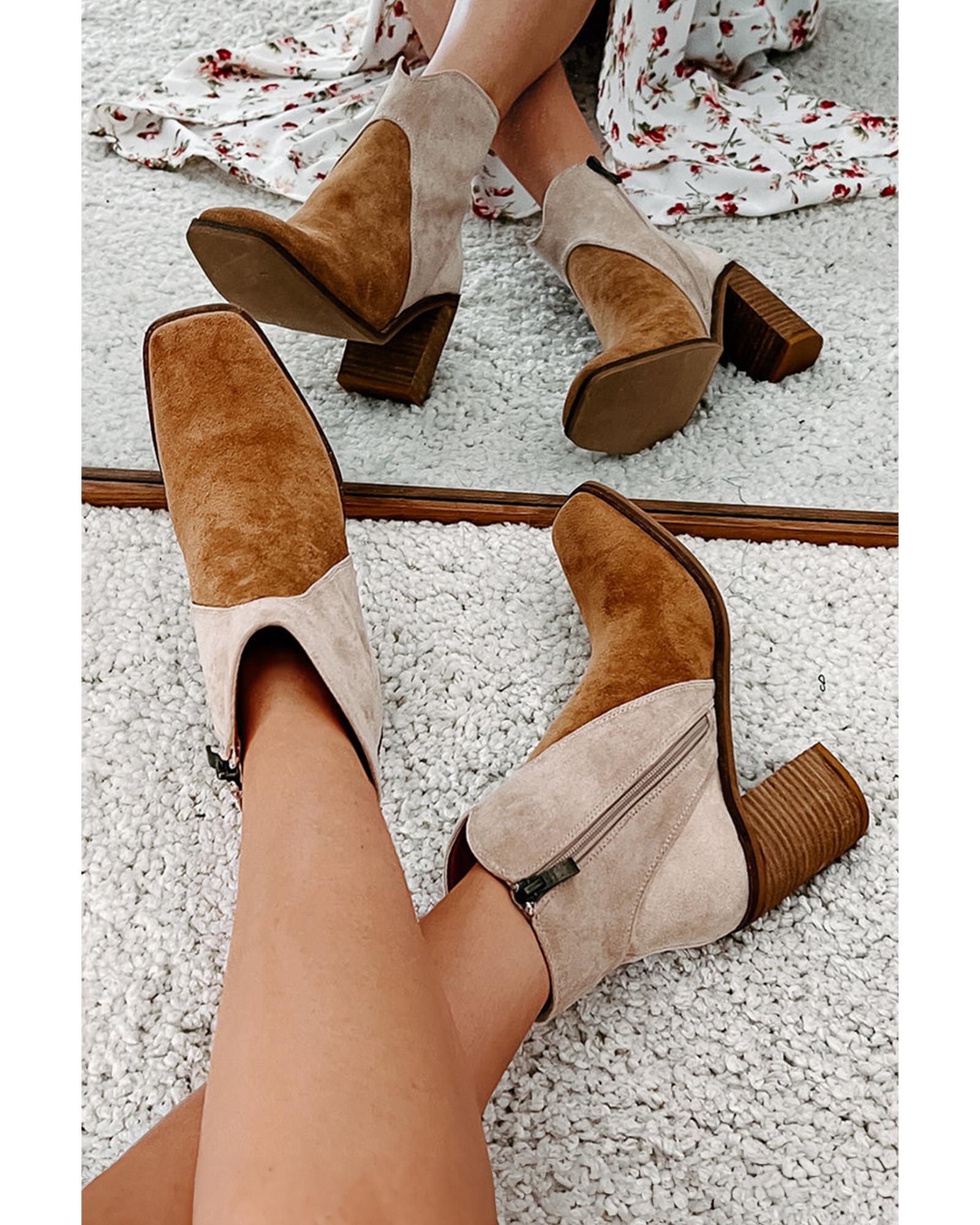 Camel Two Tone Faux Suede Square Toe Chunky Heel Boots – 38 EU