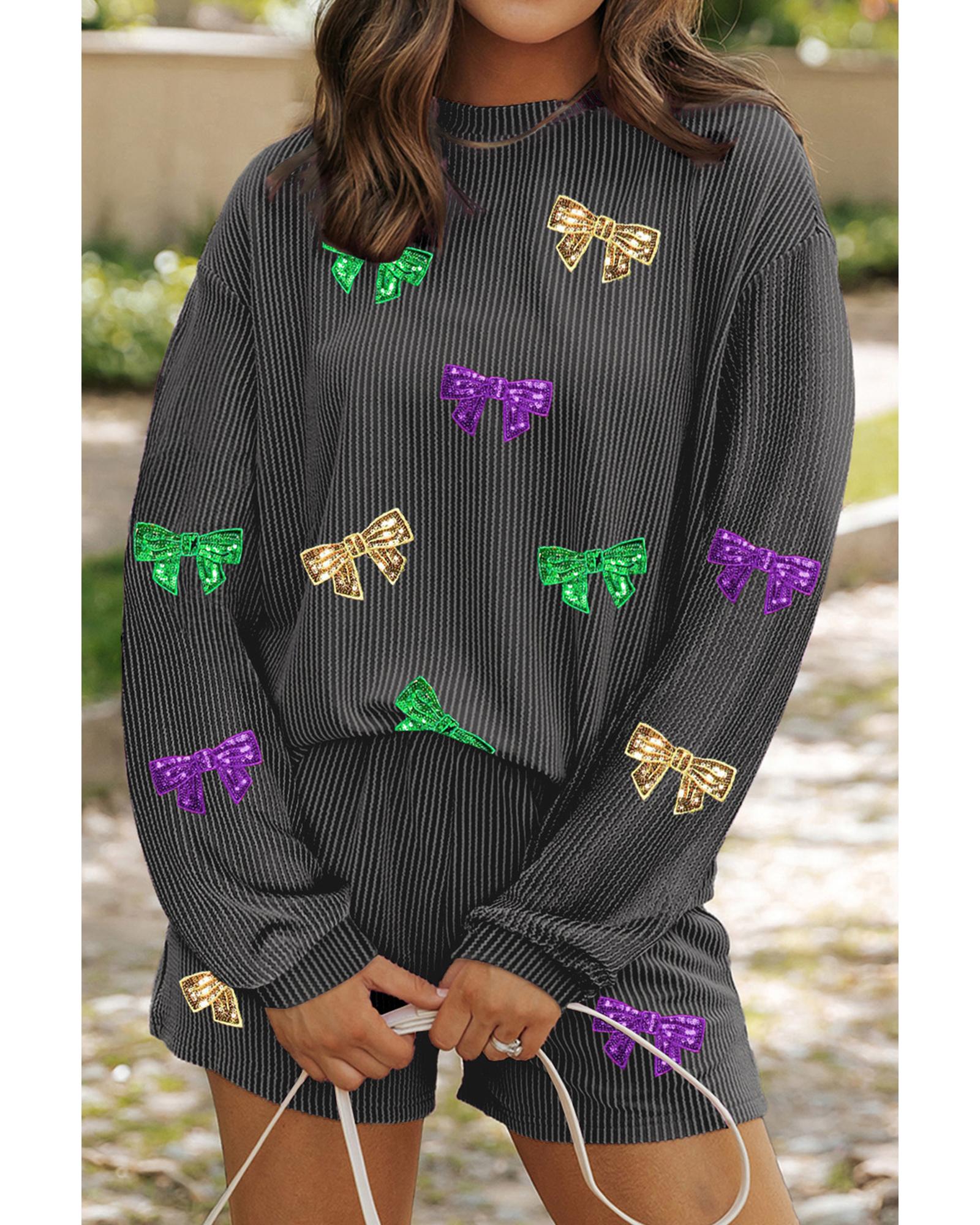 Carbon Grey Bowknot Patched Pattern Corded Long Sleeve Top and Shorts Outfit – XL
