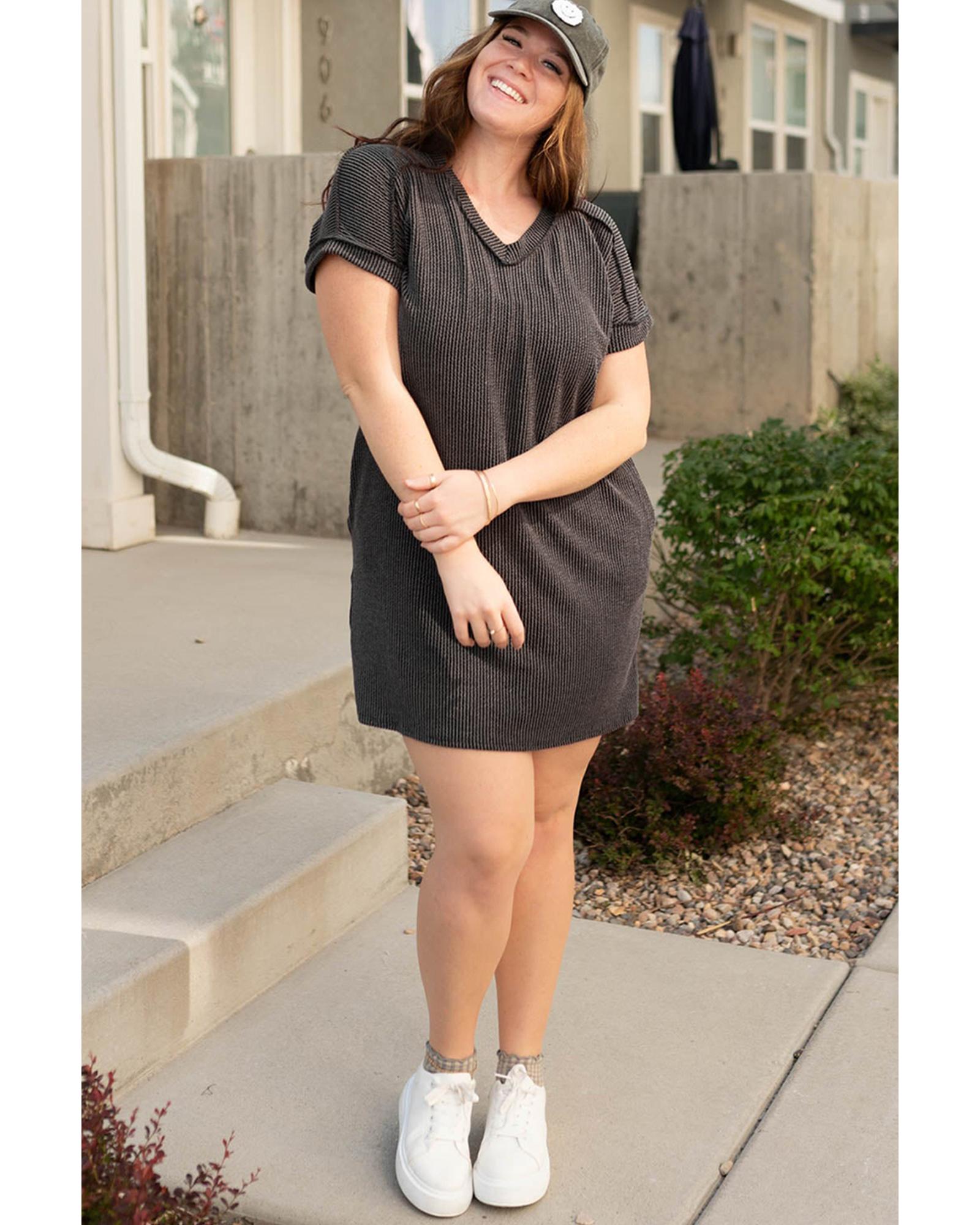 Carbon Grey Corded V Neck Plus Size T Shirt Dress with Pockets – 1X