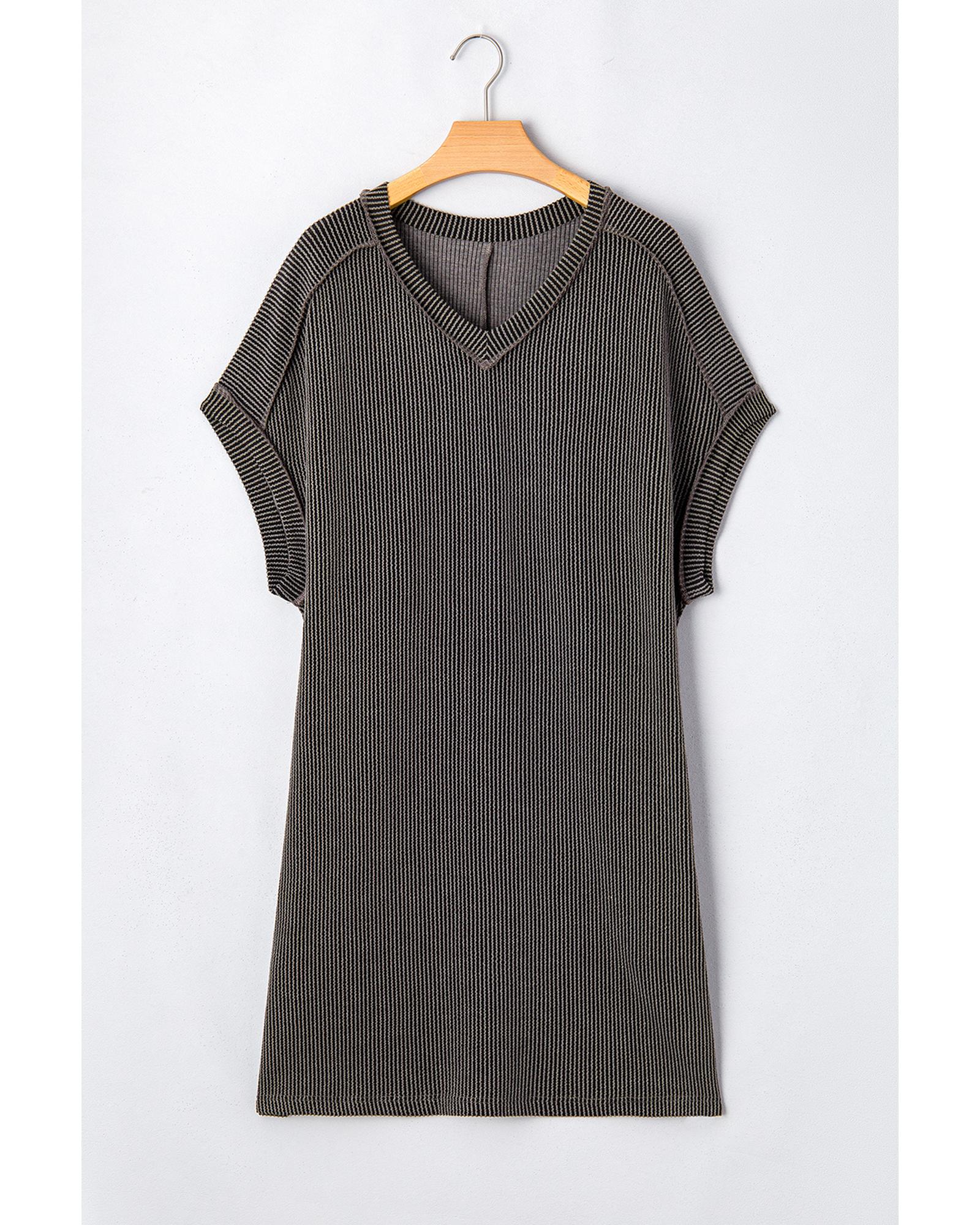 Carbon Grey Corded V Neck Plus Size T Shirt Dress with Pockets – 2X