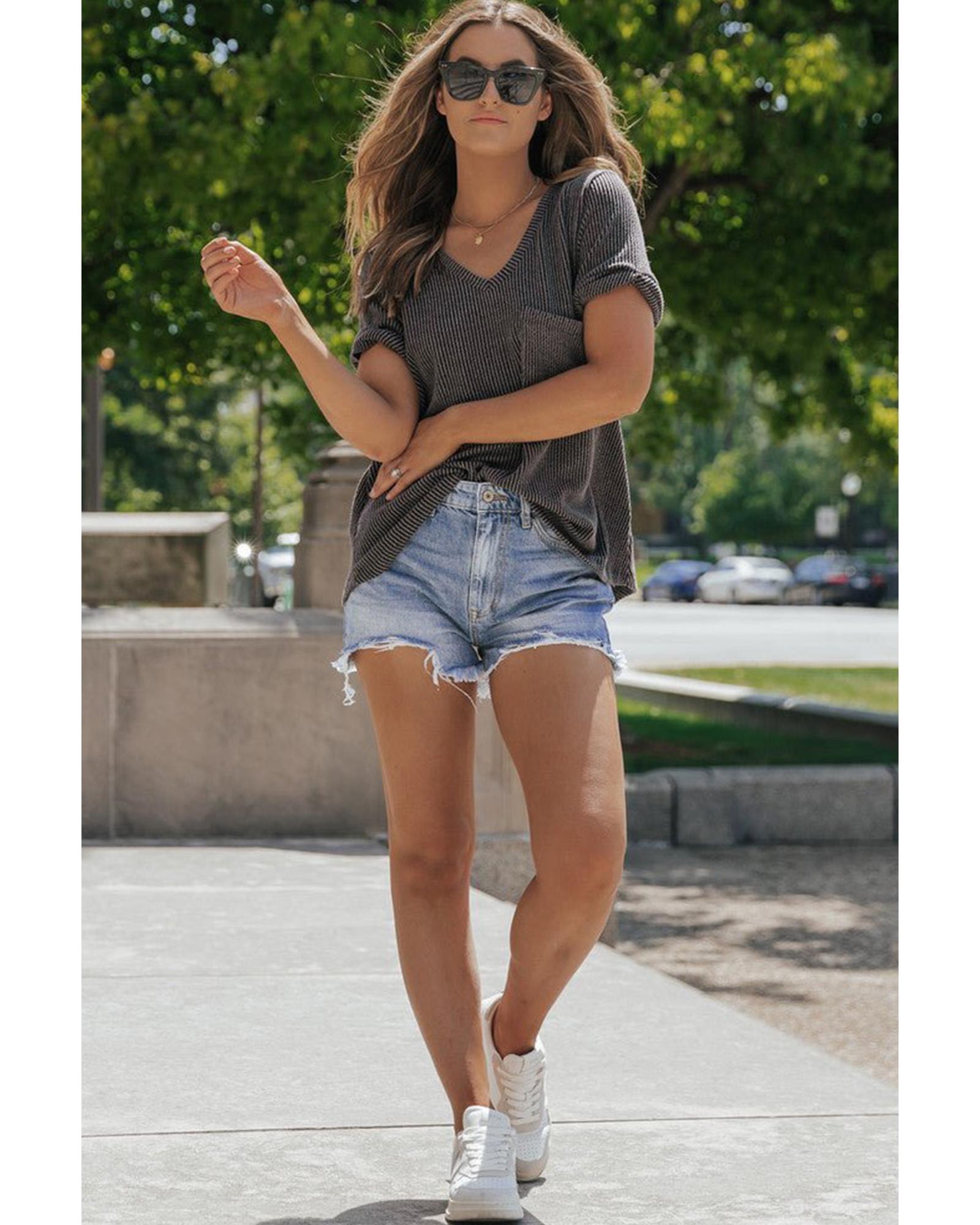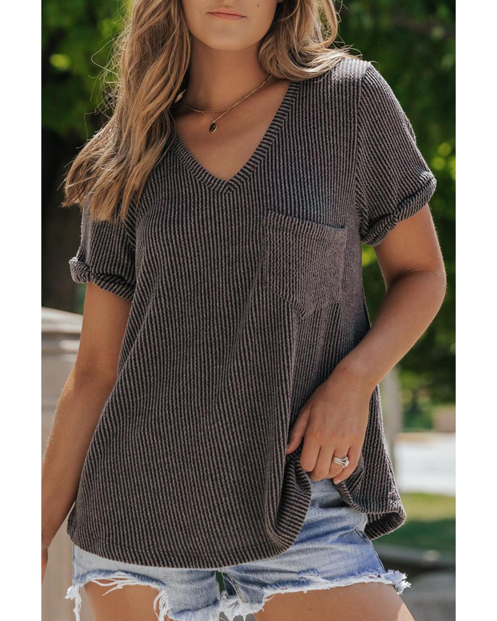 Carbon Grey Twist Short Sleeve Corded V Neck Top – M